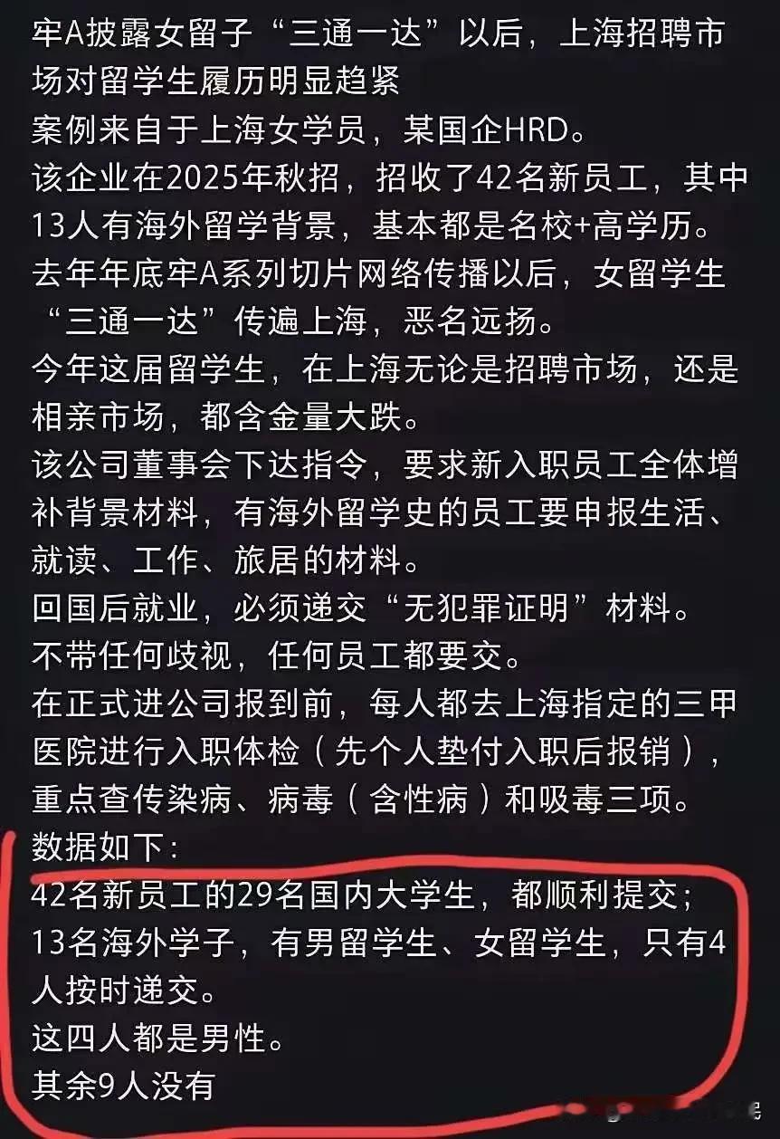 上海企业招42人,13个海归9个不敢交体检报告!真相扎心了 最近上海一家企业的招聘结果,让不少人惊掉下巴:秋招招42人,其中13个是海归留学生,结果最后只有4个男留学生按时交了入职体检报告,剩下9个直接“消失”,连后续沟通都不回应。反观29名国内大学生,全员提交报告,一个没少。 这事儿一出来,很多人猜是不是海归身体有问题?其实根本不是。核心原因很简单:现在企业招人早不看“留学光环”了,更看重实际能力和稳定性。以前觉得留过学就高人一等,现在国内教育质量上去了,本土毕业生的专业技能、实践经验一点不输海归,甚至更懂国内职场规则。 而且不少海归留学时花了大价钱,求职时预期太高,可企业给的薪资、岗位和他们想的不匹配,心里落差大,干脆就中途放弃了。还有人吐槽海归“三通一达”(英语通、海外通、消费通,能力不达标),虽然有点绝对,但也反映出部分海归缺乏核心竞争力的问题。 说白了,现在的职场早不是拼“出身”的时代了,不管是海归还是本土毕业生,有真本事、肯踏实干才是硬道理。那些抱着“留学就能躺赢”心态的人,注定要被市场淘汰。你身边有没有海归求职遇冷的情况?