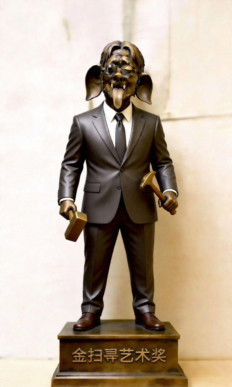 对于艺术就像文学一样,一千个读者就有一千个哈姆雷特,这是一种很主观的审美。 每个人对于美丑会有自己的评判,既然这些艺术家觉得艺术是高不可攀的,那就和电影一样,搞个“金扫帚奖”,是骡子是马就拉出来看看。 把他们这些艺术大师依据所谓的“艺术修养不足的人,不懂得艺术审美”的作品,把这些被他们自己称颂的“高高在上”的艺术作品,让所有人都来打分、评判,并设个金银铜奖。 这样就能知道谁的作品更具审美价值,谁的作品仅仅只是走歪路,浮夸、博眼球罢了。 大家觉得该不该设立“金扫帚艺术奖”呢?第一届得主会是田世信的“老子”吗?