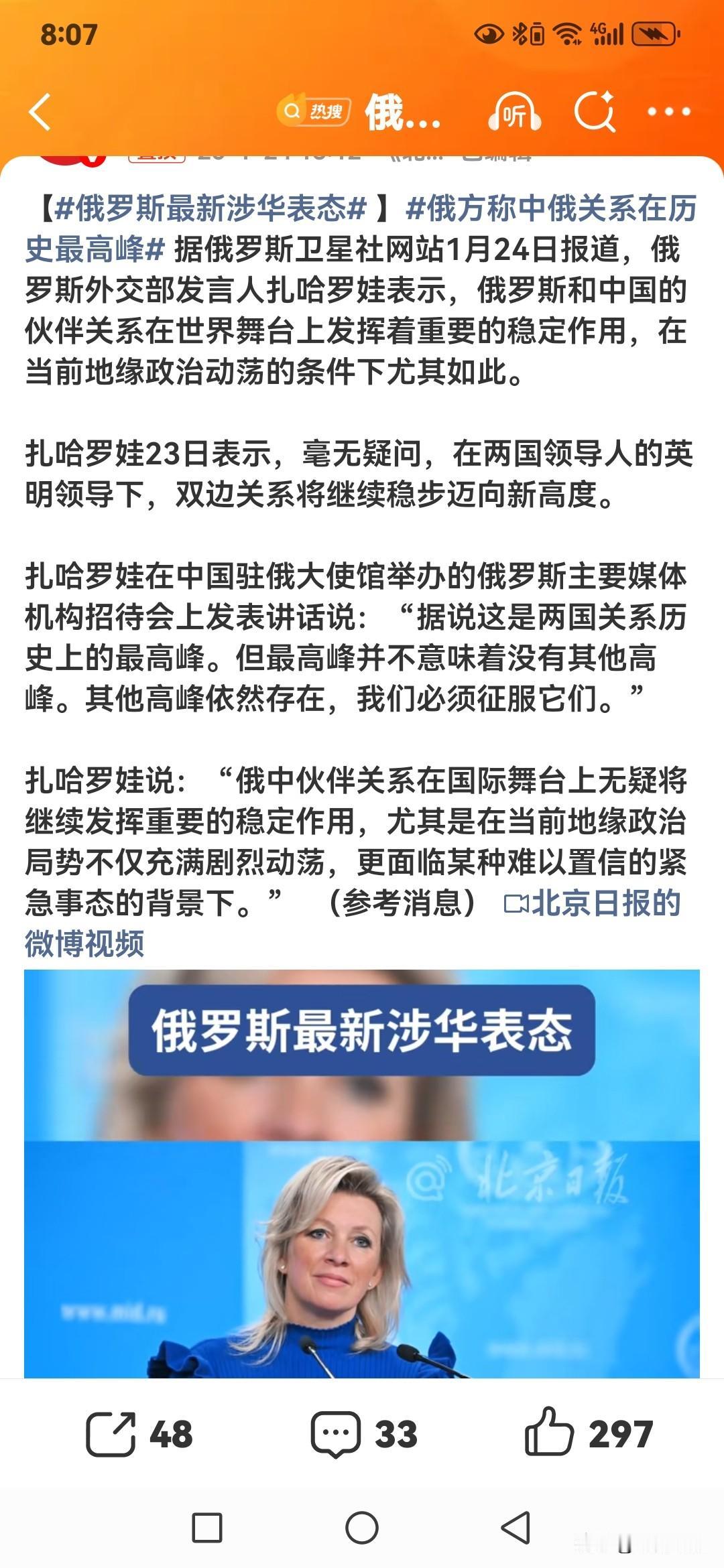 俄罗斯外交部发言人扎哈罗娃近日涉华表态太提气了。她在俄罗斯主要媒体机构招待会上称,俄中伙伴关系在世界舞台有着重要稳定作用,尤其在地缘政治动荡当下。还说虽有人认为双边关系已到历史最高峰,但还有其他高峰待攀登,俄中双边关系会稳步迈向新高度。 其实之前普京也说过,两国关系是全球稳定重要因素,会继续发展。俄中这种紧密的伙伴关系,就像定海神针,在风云变幻的国际局势中,给彼此带来安全感,也为世界和平稳定添砖加瓦。 深入分析俄罗斯 俄罗斯战略思考 中俄现状 深入剖析俄罗斯 日本涉华言论 俄罗斯重大转变