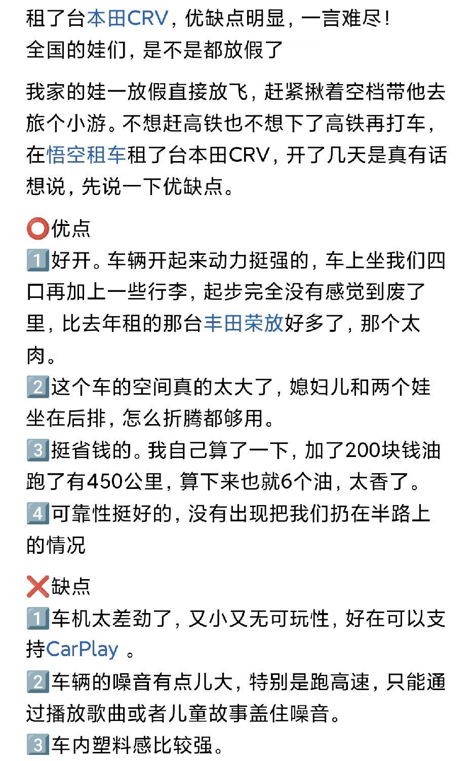 看到这个头条的时候,我个人觉得很意外,很不太理解。 哥们,你都租车了,还租本田crv干嘛?要租铁定bba保底呀。本田crv是适合家用,都租车了的话,还租这个车型干嘛呢?加速度也不咋地,租车的话也不在乎油耗。 我在租车行就没看到过有本田crv这个车型给大家租的,因为正常人都不会租本田crv。