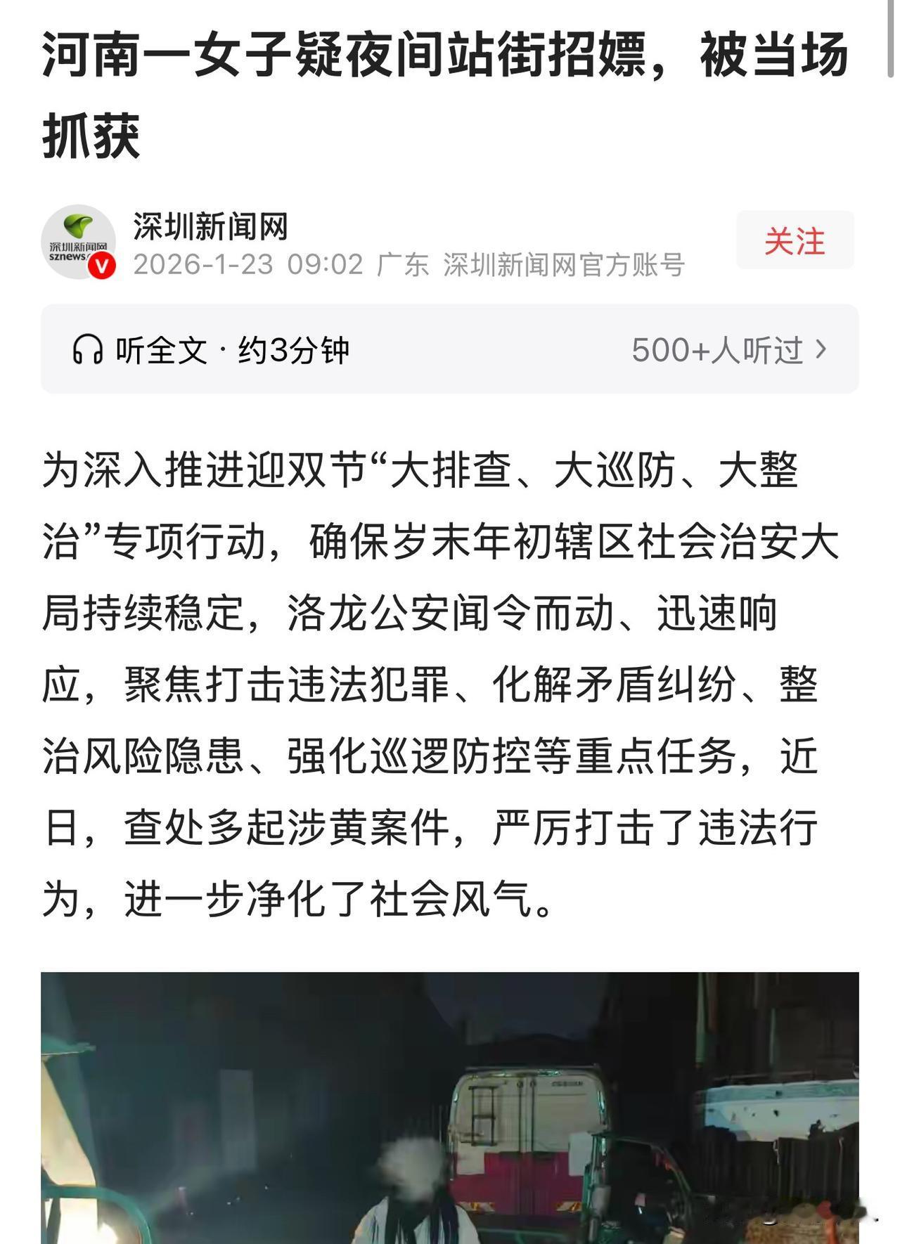 “给民警点赞!”河南,深夜11点,民警巡逻时发现一女子站在街边晃悠,民警起疑了,将女子带回去调查,女子害怕了,交代出其是从事不正当行业的! 1月14号晚上11点来钟,正是夜深人静的时候,大部分人都已经睡熟了,但负责夜间巡逻的民警们还在岗位上忙活,就为了守护辖区的治安。 当时民警们像往常一样在街边巡逻,走到一处路段时,注意到有个女子有点不对劲。 这姑娘在路边来回溜达,眼神还总往过往的单身男子身上瞟,时不时凑上去跟人搭几句话,那举动看着就挺可疑,像是在做站街招嫖的勾当。 民警们没有立刻上前,而是先在一旁仔细观察确认。 看了一会儿,发现这女子果然是在拉客招嫖,跟好几名路人都有疑似交易的攀谈,违法行为很明显。 确认清楚后,民警们马上行动,上前将这名女子当场控制住。 被抓之后,女子被带回派出所接受询问。面对民警的问话和已经掌握的证据,她也没什么可狡辩的,老老实实地承认了自己确实在公共场所拉客招嫖的违法事实。 根据《中华人民共和国治安管理处罚法》的相关规定,在公共场所拉客招嫖本身就是违法行为,得受到相应的处罚。 目前,这名女子已经被警方依法作出了行政处罚,为自己的一时糊涂付出了代价。 深夜11点,大家都窝在温暖的被窝里休息,可民警们还得顶着夜色巡逻,不放过任何可疑情况,这份责任心真的让人敬佩。 正是因为他们的“不打烊”守护,才能及时遏制住这类破坏社会风气的违法行为,让我们的生活环境更安全、更干净。 再说说那名女子,好好的路不走,偏偏要触碰法律红线,图一时之利做违法的事儿,最后落得个被行政处罚的下场,实在不值。 公共场所拉客招嫖不仅违背公序良俗,还会扰乱社会治安,影响城市形象,法律早就有明确规定,这是绝对不能碰的“高压线”。 其实不管是为了什么,赚钱也好、图方便也罢,都得在合法合规的前提下,靠自己的双手踏实打拼,走歪门邪道迟早要付出代价。 还有一点挺重要的,岁末年初本来就是各类违法犯罪的高发期,警方加大巡逻和打击力度太有必要了。 但维护社会治安也不是警方一方的事儿,需要我们每个人都参与进来。 咱们普通人既要做到遵纪守法,不越雷池半步,要是遇到这类违法违规行为,也该及时向警方举报,一起为营造风清气正的社会环境出份力。 毕竟,只有大家都守规矩、明底线,才能安安稳稳过日子,这才是最实在的。