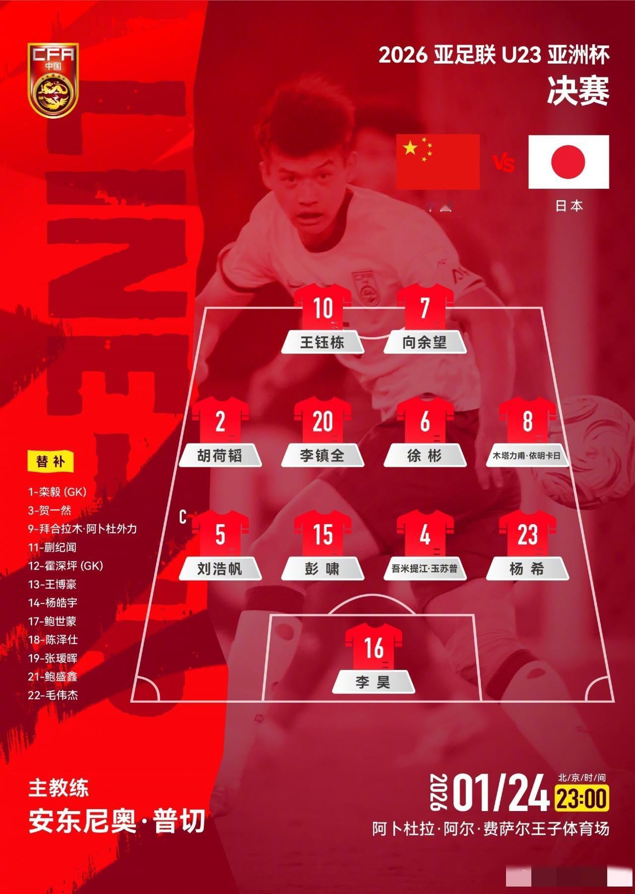 01月24日23点,U23亚洲杯决赛,中国男足U23vs日本U23 我的今日状态:😁 我这里的天气:☀️晴天
