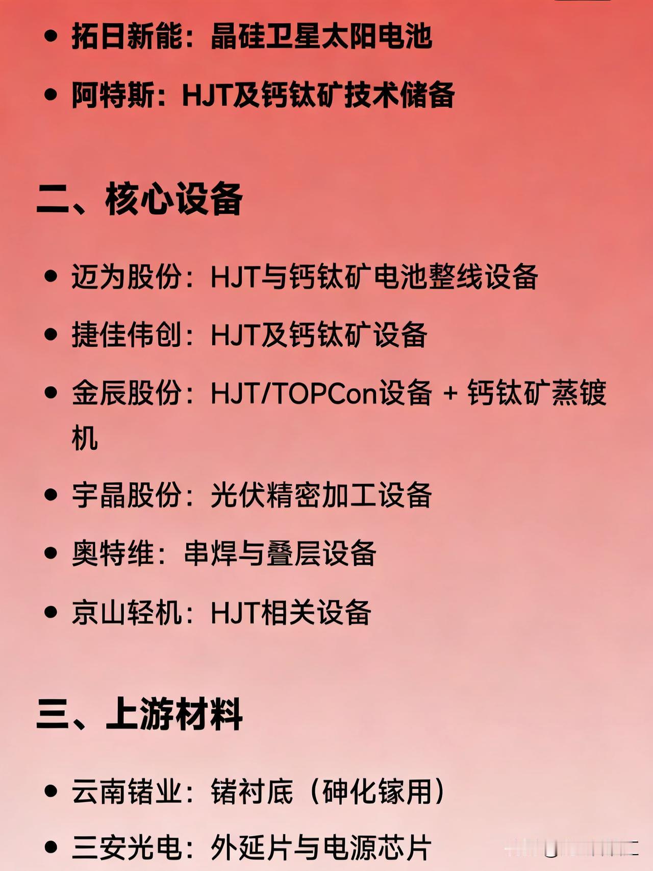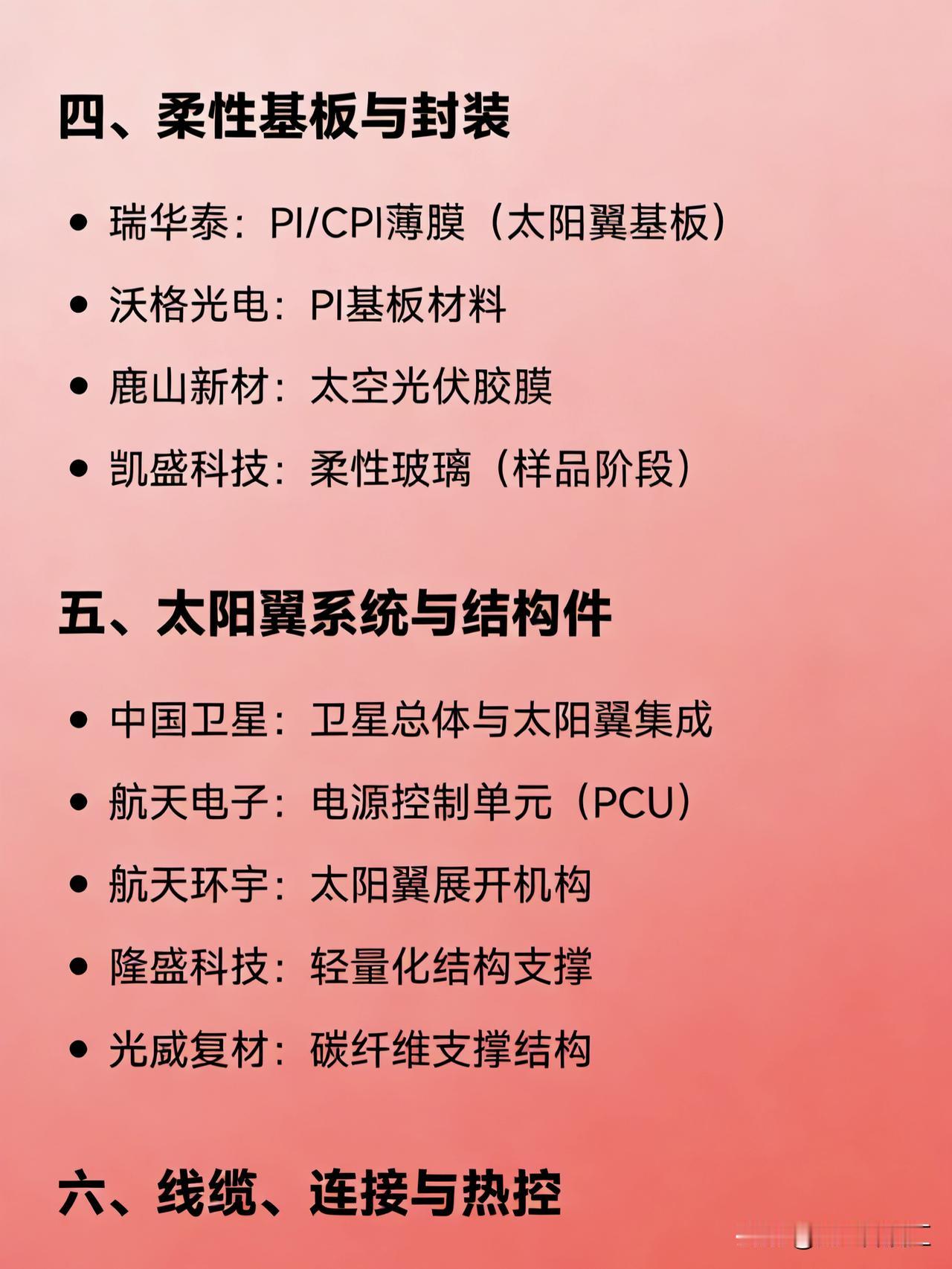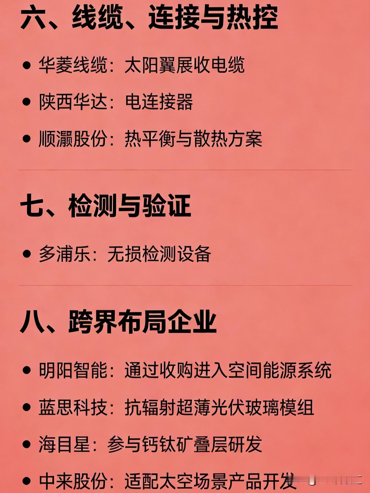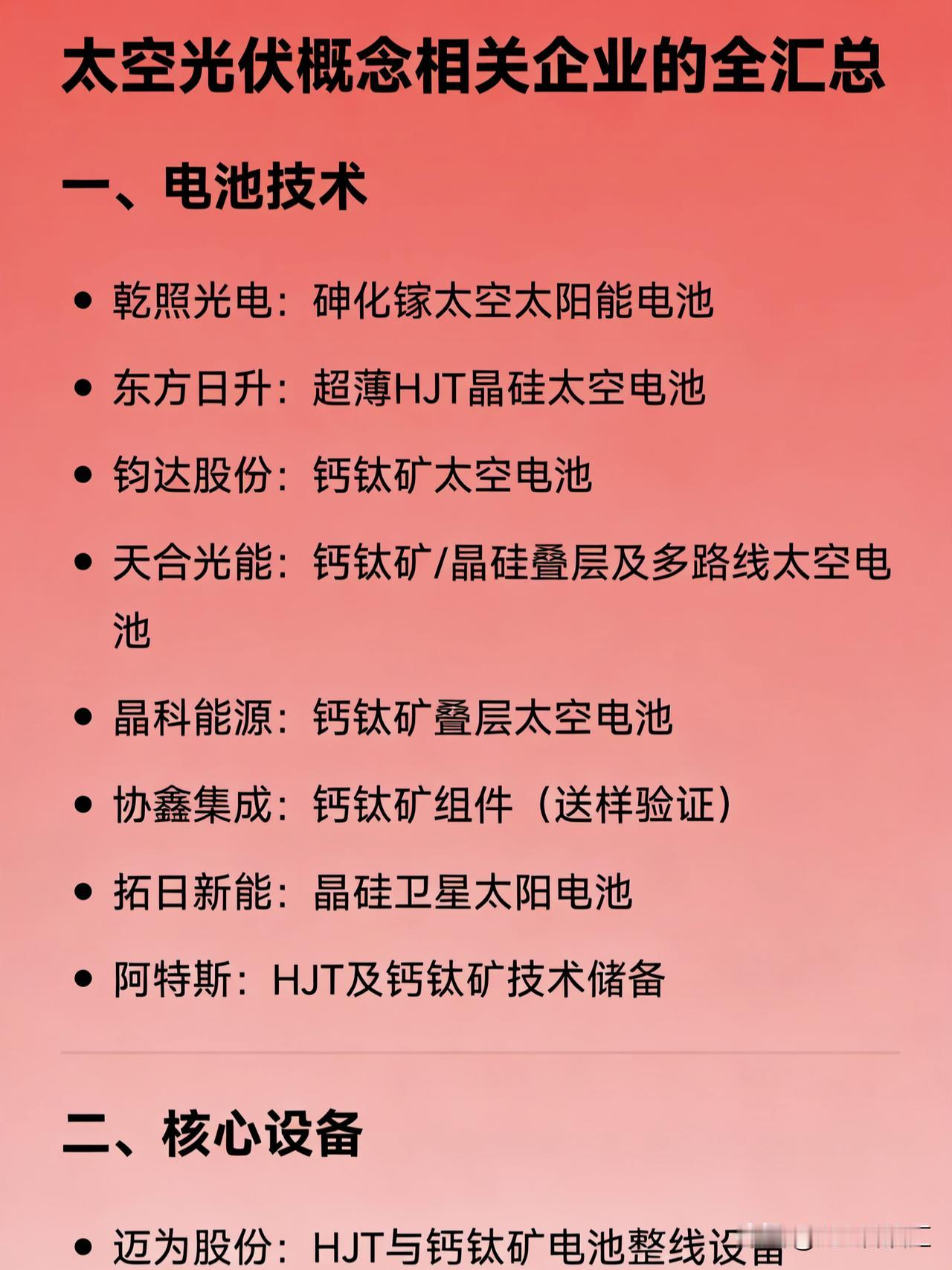 太空光伏概念相关企业的全汇总 一、电池技术 乾照光电:砷化镓太空太阳能电池 东方日升:超薄HJT晶硅太空电池 钧达股份:钙钛矿太空电池 天合光能:钙钛矿/晶硅叠层及多路线太空电池 晶科能源:钙钛矿叠层太空电池 协鑫集成:钙钛矿组件(送样验证) 拓日新能:晶硅卫星太阳电池 阿特斯:HJT及钙钛矿技术储备 二、核心设备 迈为股份:HJT与钙钛矿电池整线设备 捷佳伟创:HJT及钙钛矿设备 金辰股份:HJT/TOPCon设备 + 钙钛矿蒸镀机 宇晶股份:光伏精密加工设备 奥特维:串焊与叠层设备 京山轻机:HJT相关设备 三、上游材料 云南锗业:锗衬底(砷化镓用) 三安光电:外延片与电源芯片 有研新材:高纯镓 南大光电:高纯MO源 正帆科技:电子特气(磷烷等) 四、柔性基板与封装 瑞华泰:PI/CPI薄膜(太阳翼基板) 沃格光电:PI基板材料 鹿山新材:太空光伏胶膜 凯盛科技:柔性玻璃(样品阶段) 五、太阳翼系统与结构件 中国卫星:卫星总体与太阳翼集成 航天电子:电源控制单元(PCU) 航天环宇:太阳翼展开机构 隆盛科技:轻量化结构支撑 光威复材:碳纤维支撑结构 六、线缆、连接与热控 华菱线缆:太阳翼展收电缆 陕西华达:电连接器 顺灏股份:热平衡与散热方案 七、检测与验证 多浦乐:无损检测设备 八、跨界布局企业 明阳智能:通过收购进入空间能源系统 蓝思科技:抗辐射超薄光伏玻璃模组 海目星:参与钙钛矿叠层研发 中来股份:适配太空场景产品开发