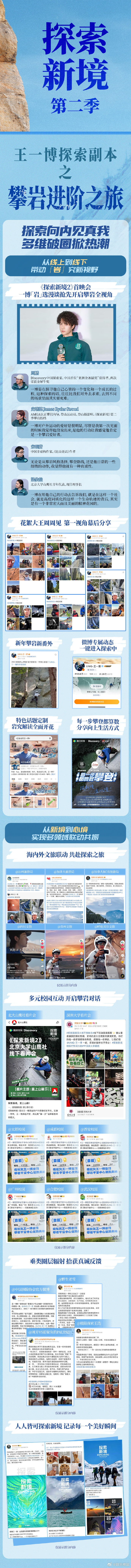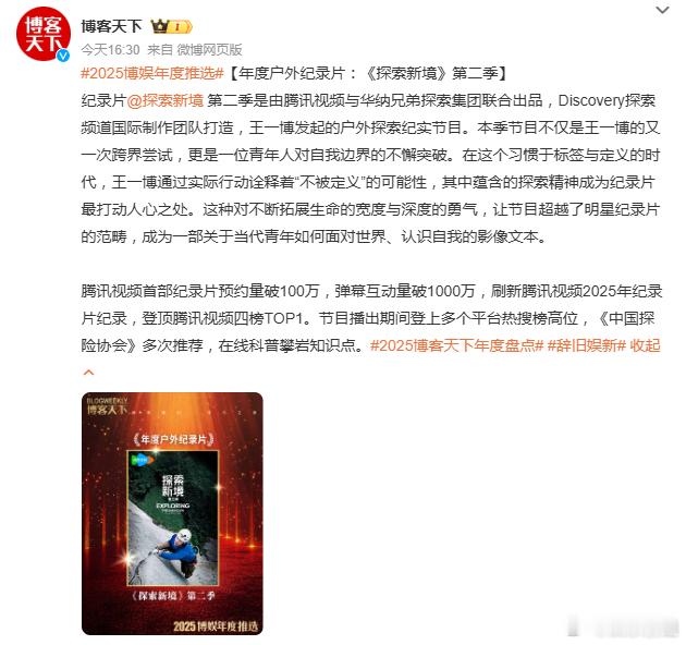 王一博探索新境2年度户外纪录片恭喜王一博《探索新境》第二季荣获《博客天下》“2025博娱年度推选”——年度户外纪录片,王一博就这样以一人之力带动整个攀岩运动,王一博“不被定义”的人生充满了无限可能,永攀高峰探索新境22025微博之夜爆款创作大赛