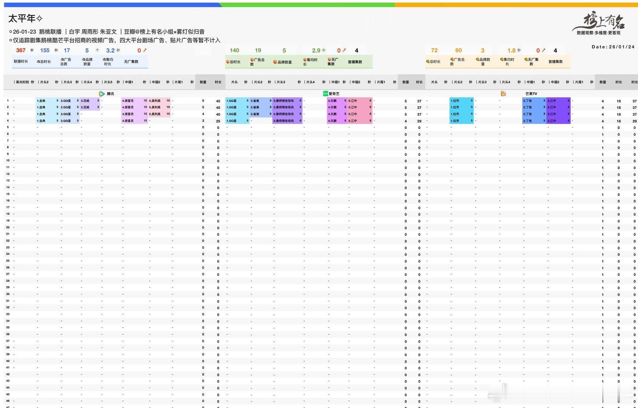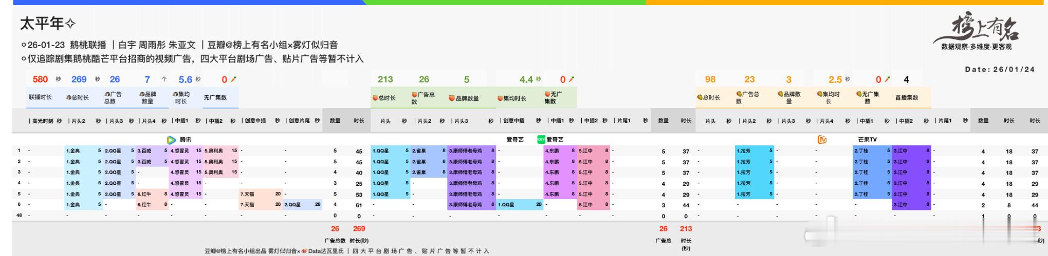 白宇、周雨彤、朱亚文太平年首日招商三平台联播首日的招商三平台总时长367s其中🐧155s+🥝140s+🥭72s次日三平台总时长580s其中🐧269s+🥝213s+🥭98s首日热度🐧19902+🥝4682次日热度太平年腾讯热度破22000 实时22292太平年爱奇艺热度破6500 实时6571酷云收视21-23点:1-2集0.7766其中第1集:1.0822,第2集0.4828次日台播断更 首日播放量云合547万,酷云点播801万