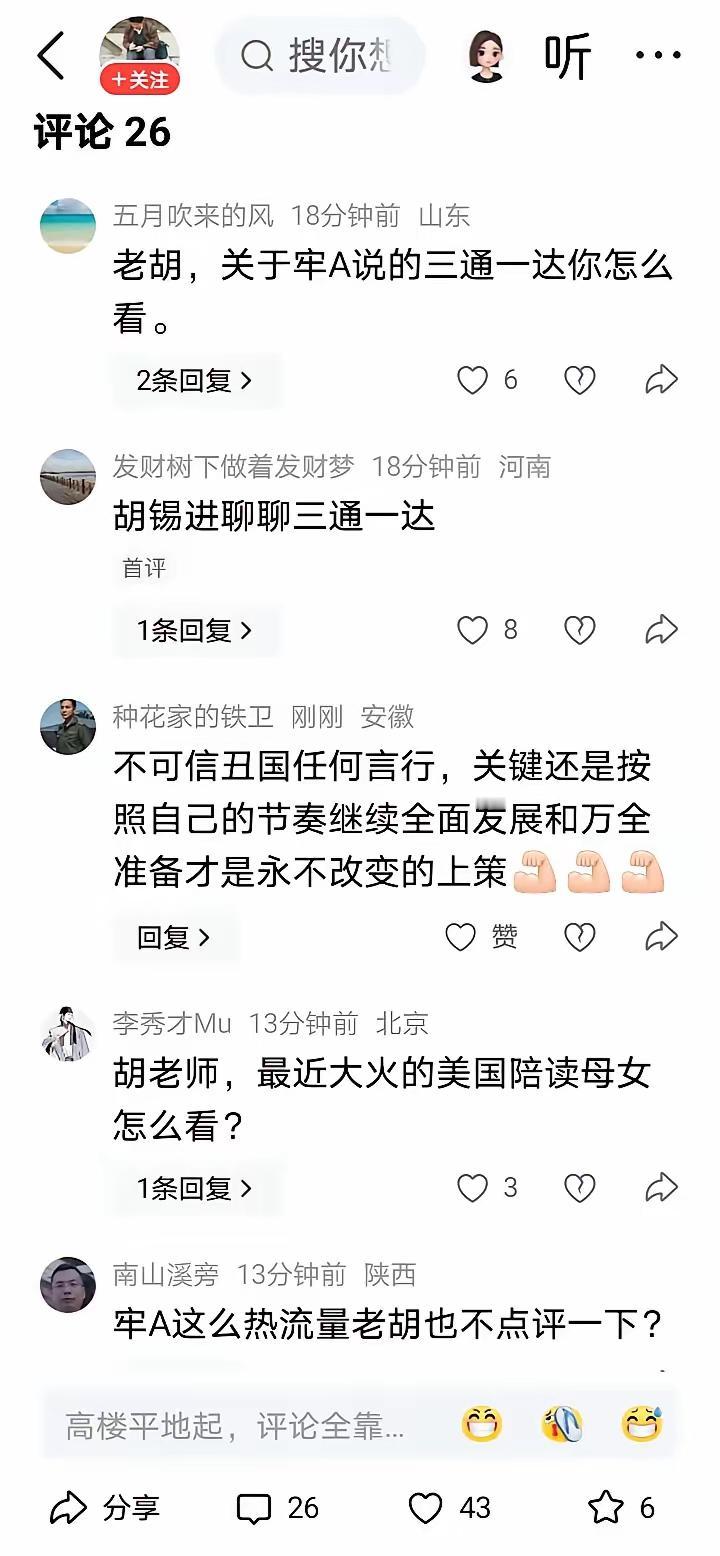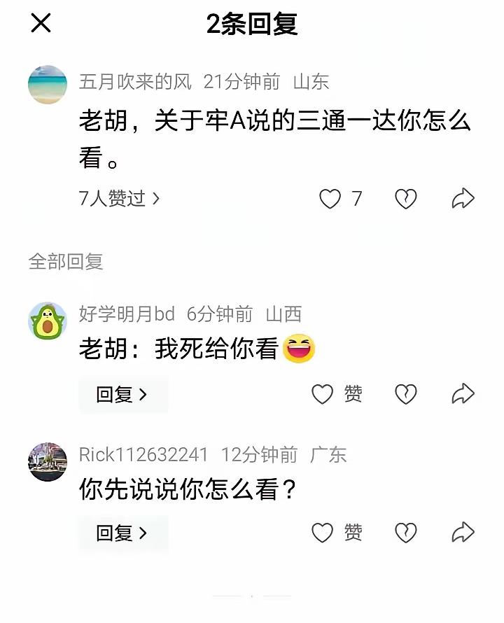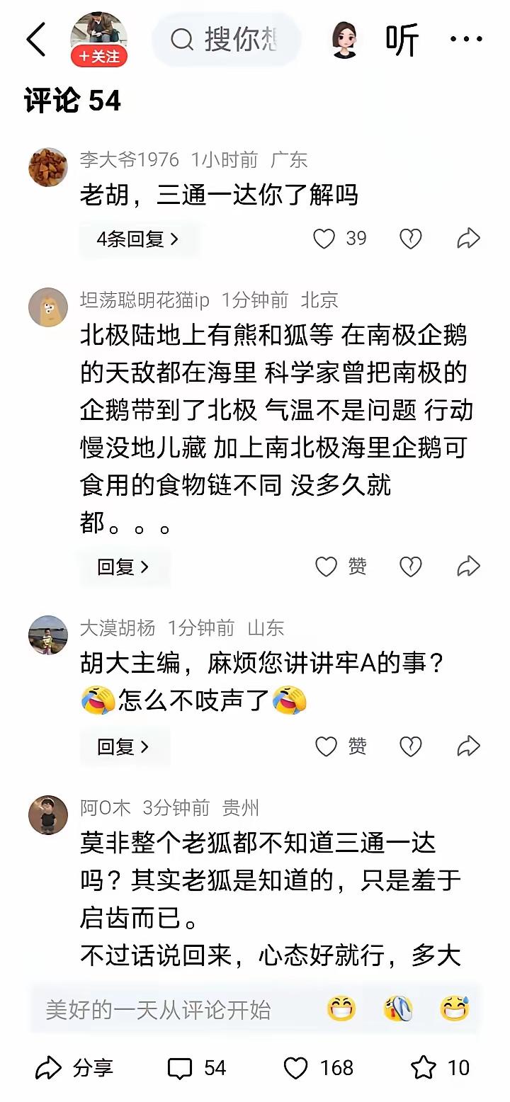 牢A全网的大热点,老胡一句没点评。 网友追着问三通一达,老胡一句没吭声。 正奇怪为啥喜欢追热点的老胡这么沉默。 有网友说:老胡女儿在美工作过。 大伙说说,这会是老胡一直沉默的缘故吗?