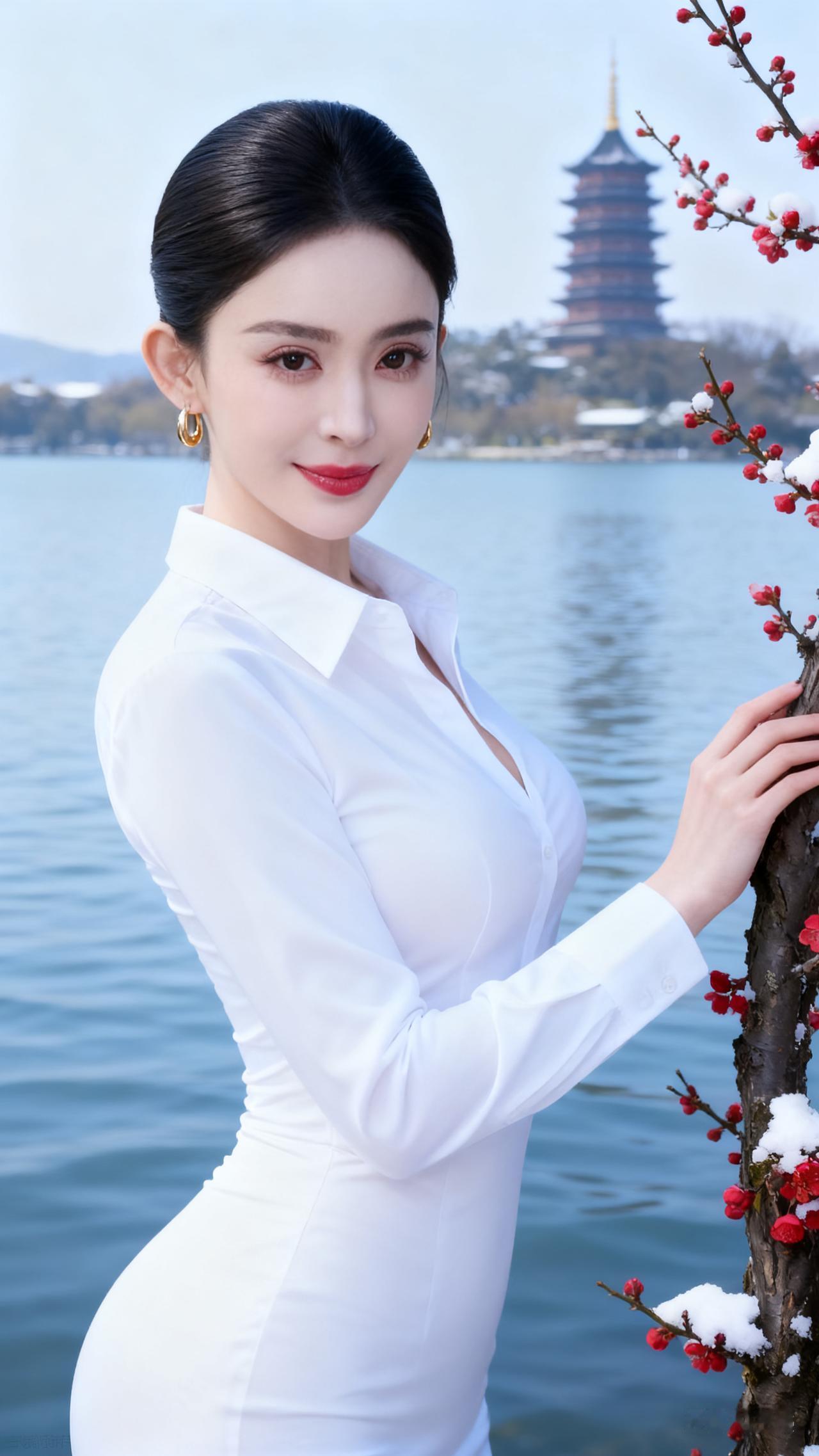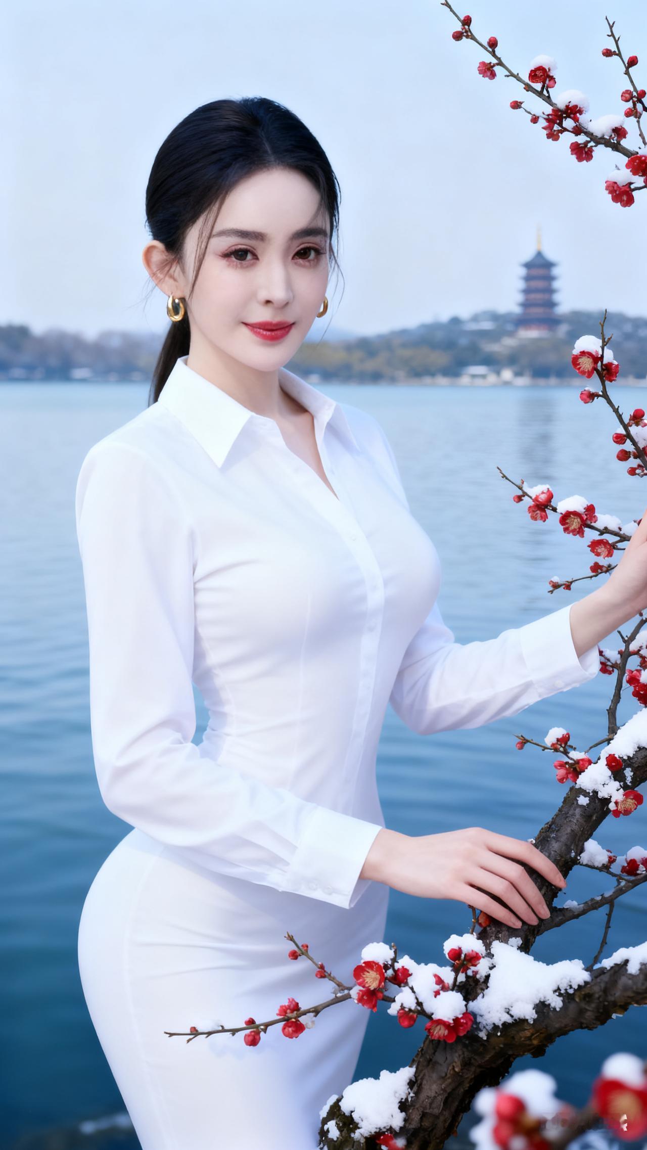 冬日暖阳下的白衣少女,与红梅相映成趣。