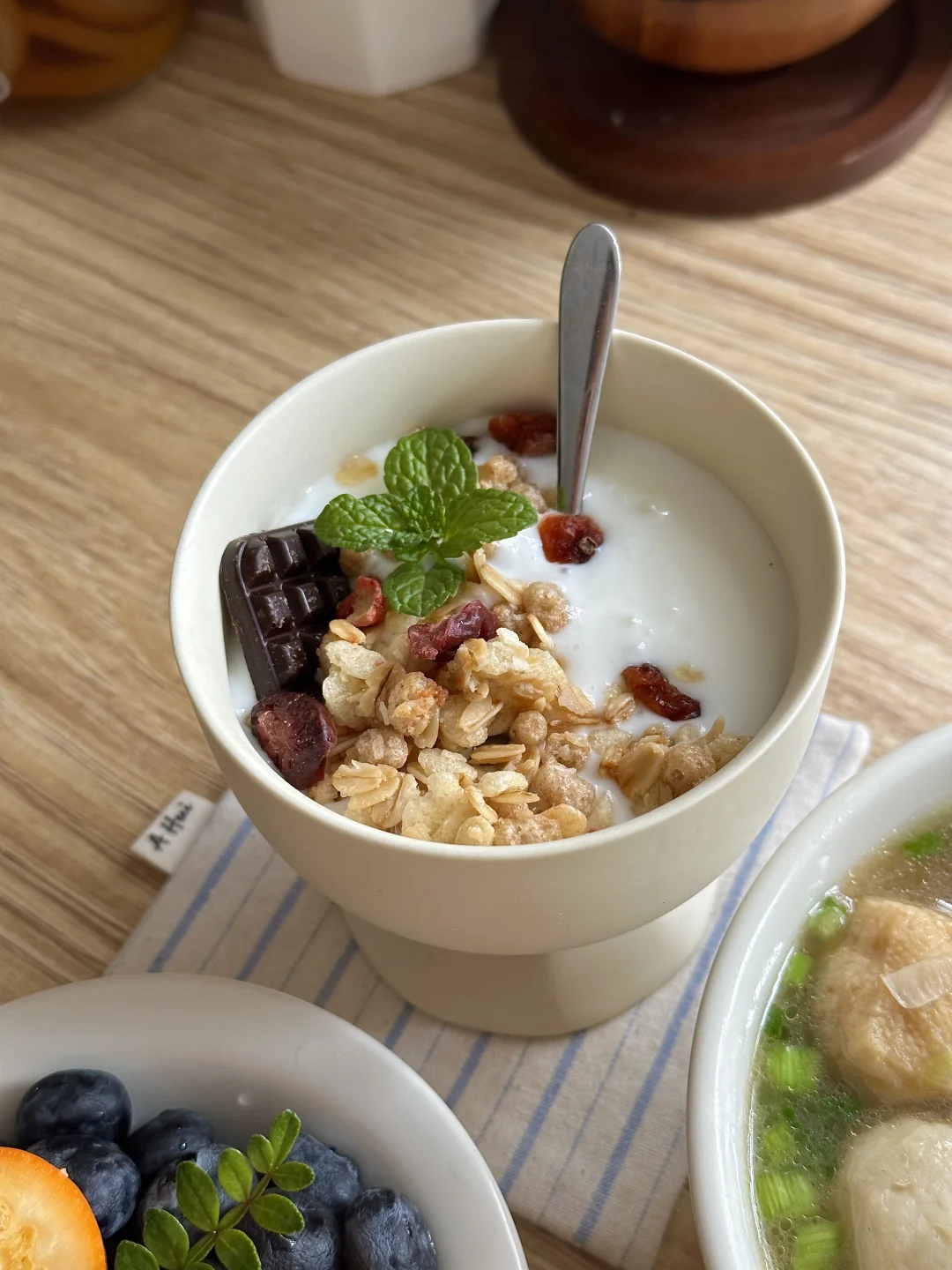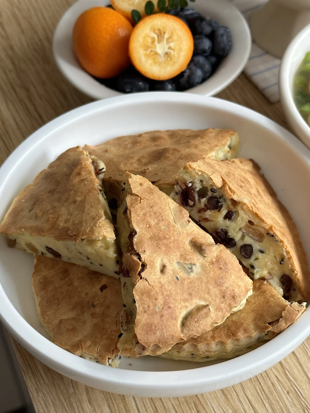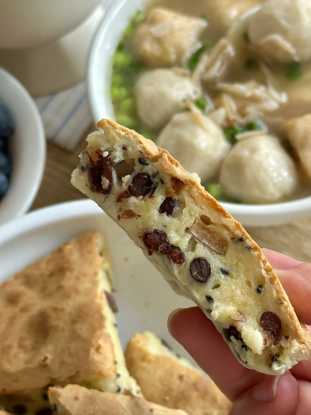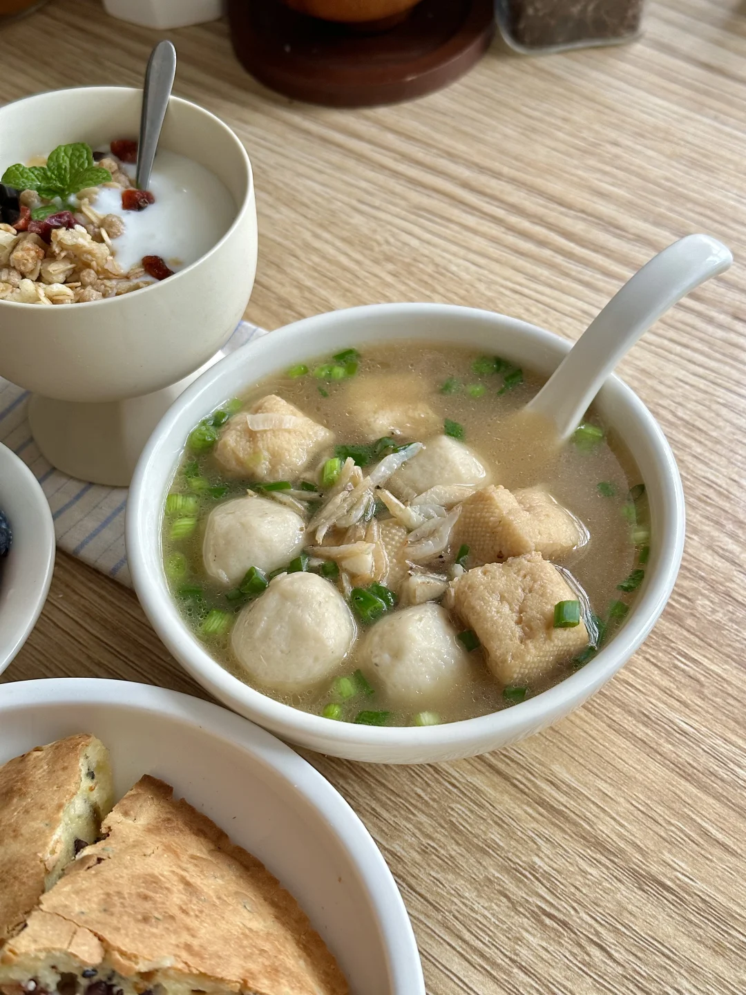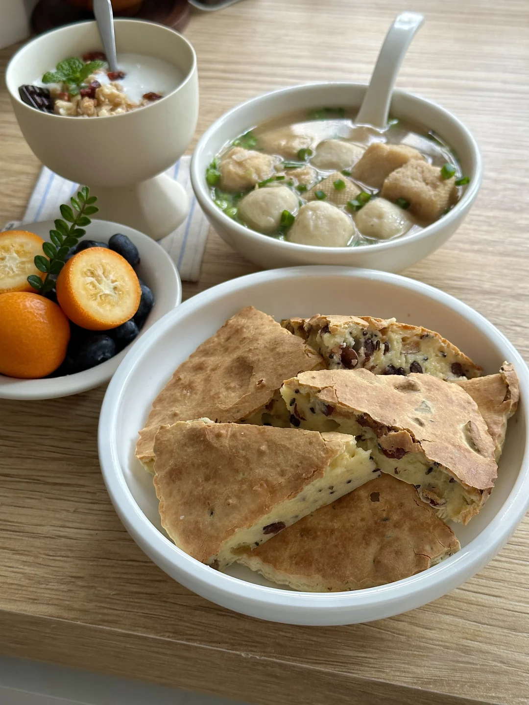 早餐分享: 🫓烤脆皮糯米糕 🍢鱼丸汤 🫐蓝莓 🍧酸奶 🤗今日冬日早餐 又是满意的一餐! 烤好的糯米糕表面脆脆的 里面很软糯 红枣、蜜豆很香甜,好吃哦! 🍢 鱼丸油豆腐汤很简单 加了虾皮,调味加了鱼露 一个字,鲜~