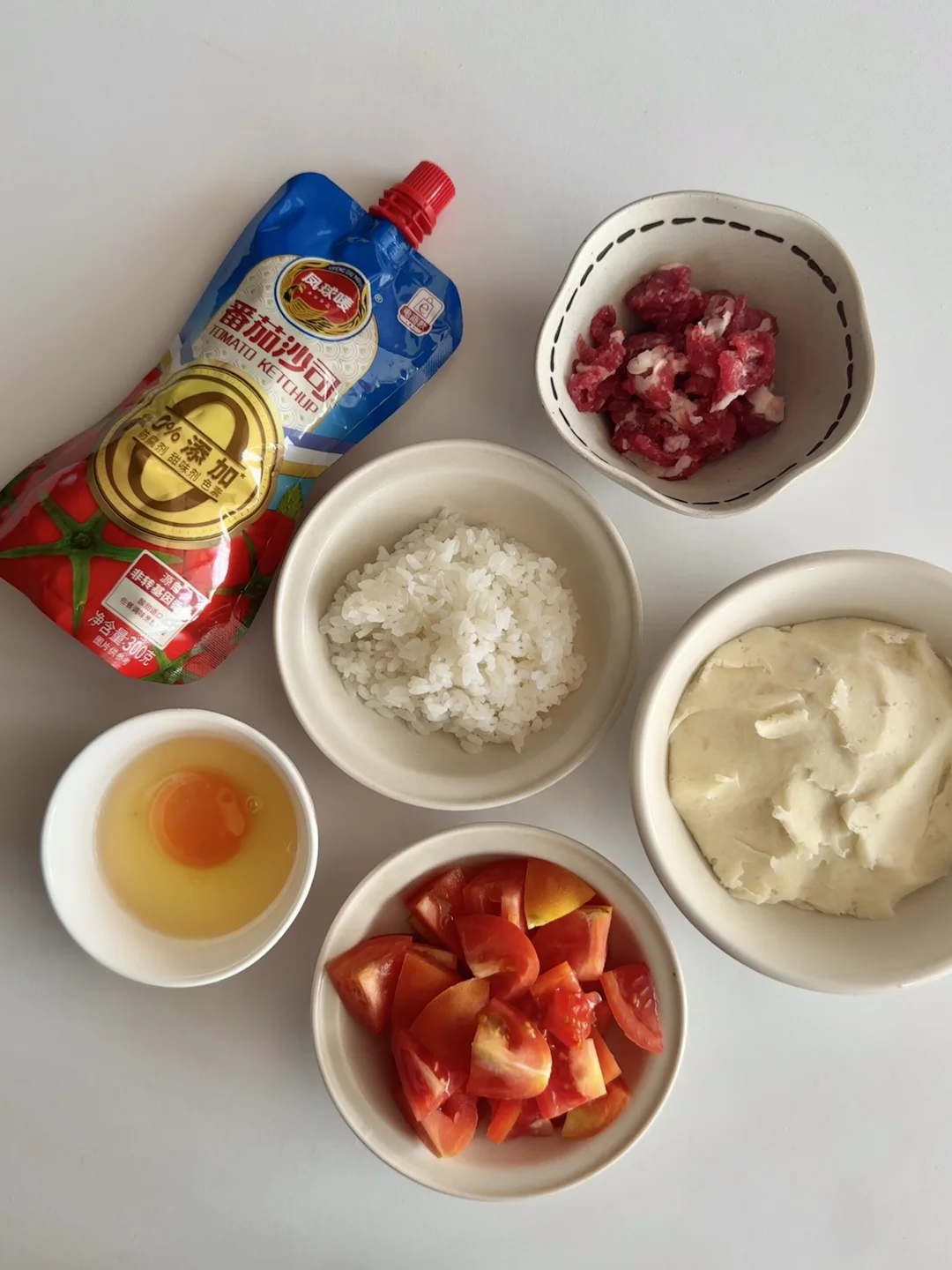 材料:凤球唛番茄酱、新鲜番茄、山药泥、米饭、鸡蛋、牛肉