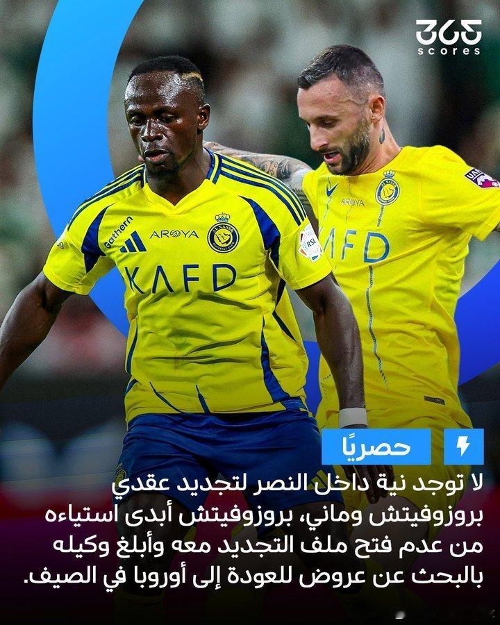 C罗和利雅得 据 365Scores:利雅得胜利俱乐部不打算与萨迪奥·马内和布罗佐维奇续约。布罗佐维奇对利雅得胜利不续约表示不满。他告诉经纪人,要留意明年夏天重返欧洲的机会。与此同时利雅得胜利收到 PIF 某俱乐部的正式报价,希望以一笔可观的金额签下阿姆里,如果球员同意离开,主教练热苏斯将对他的命运拥有最终决定权。另外利雅得胜利没有签下后卫阿里·布莱希的计划。与此同时,吉达联合的球员阿卜杜勒拉赫曼·阿布德被推荐给利雅得胜利,但谈判尚未进入正式阶段,此事仍处于推荐阶段。