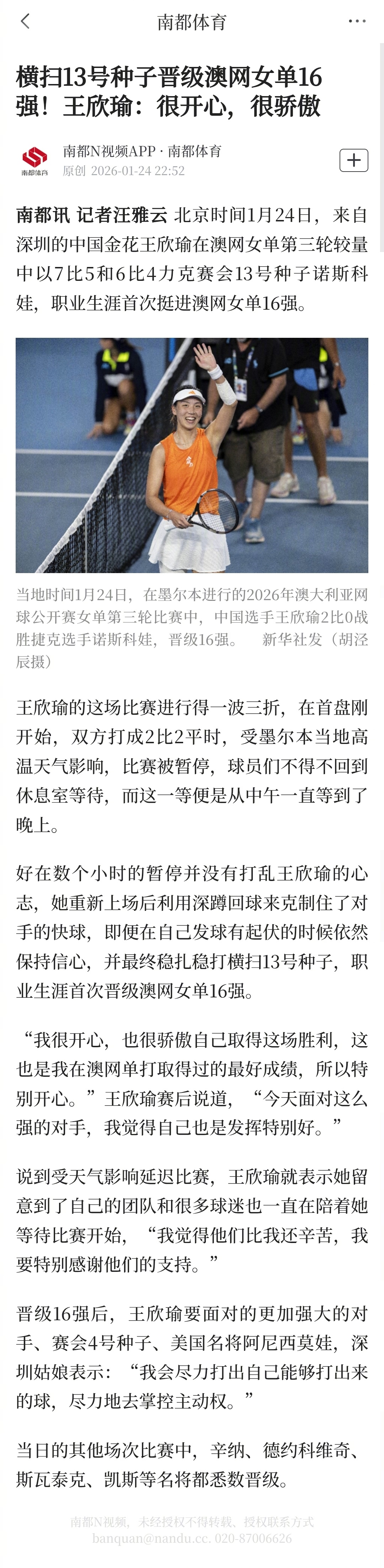 【横扫13号种子晋级澳网女单16强!王欣瑜:很开心,很骄傲】北京时间1月24日,来自深圳的中国金花王欣瑜在澳网女单第三轮较量中以7比5和6比4力克赛会13号种子诺斯科娃,职业生涯首次挺进澳网女单16强。王欣瑜的这场比赛进行得一波三折,在首盘刚开始,双方打成2比2平时,受墨尔本当地高温天气影响,比赛被暂停,球员们不得不回到休息室等待,而这一等便是从中午一直等到了晚上。好在数个小时的暂停并没有打乱王欣瑜的心志,她重新上场后利用深蹲回球来克制住了对手的快球,即便在自己发球有起伏的时候依然保持信心,并最终稳扎稳打横扫13号种子,职业生涯首次晋级澳网女单16强。“我很开心,也很骄傲自己取得这场胜利,这也是我在澳网单打取得过的最好成绩,所以特别开心。”王欣瑜赛后说道,“今天面对这么强的对手,我觉得自己也是发挥特别好。”说到受天气影响延迟比赛,王欣瑜就表示她留意到了自己的团队和很多球迷也一直在陪着她等待比赛开始,“我觉得他们比我还辛苦,我要特别感谢他们的支持。”晋级16强后,王欣瑜要面对的更加强大的对手、赛会4号种子、美国名将阿尼西莫娃,深圳姑娘表示:“我会尽力打出自己能够打出来的球,尽力地去掌控主动权。”当日的其他场次比赛中,辛纳、德约科维奇、斯瓦泰克、凯斯等名将都悉数晋级。采写:南都N视频记者 汪雅云