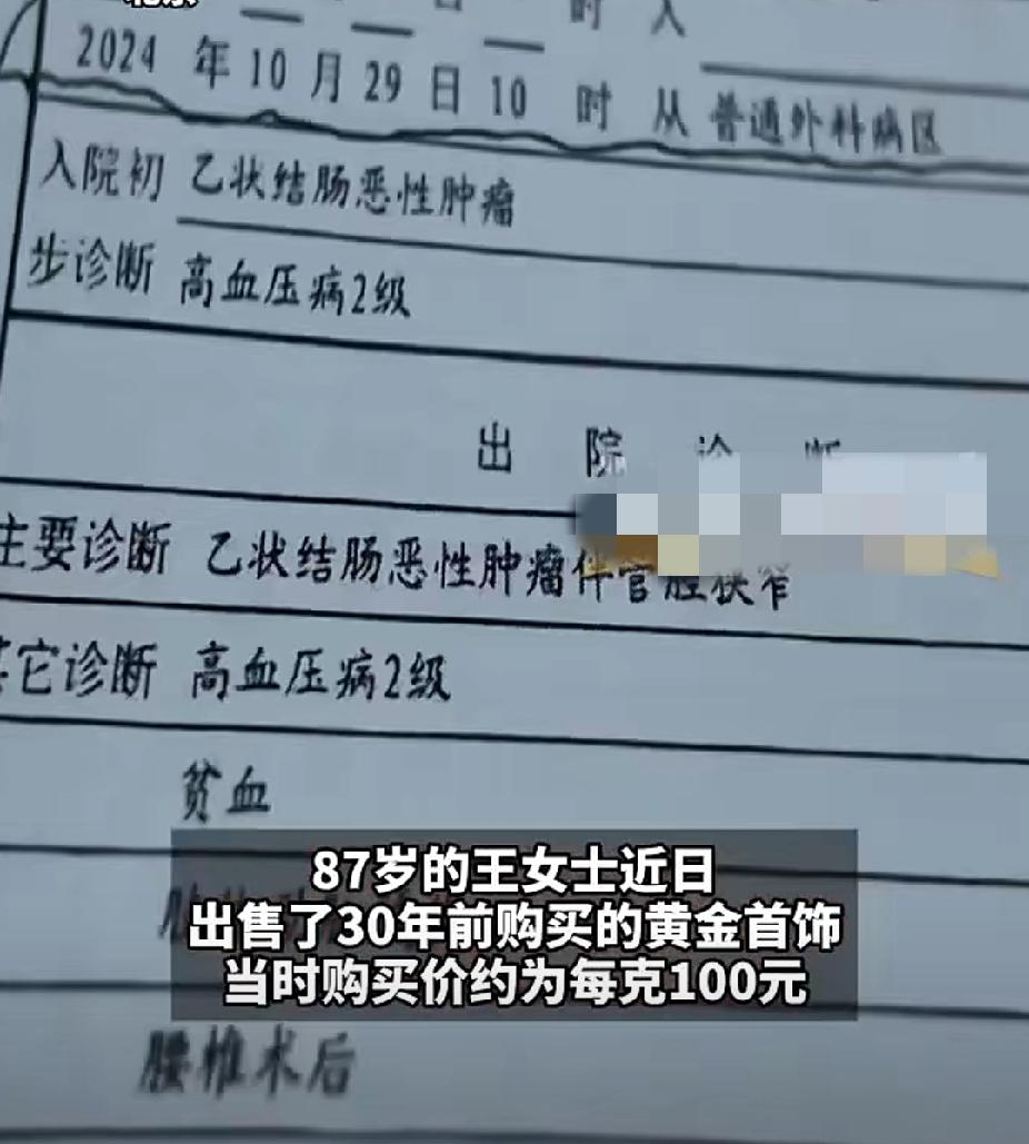 看哭了!老人结肠癌晚期,卖掉30年前买的黄金首饰,最后亲吻戒指说:“反正我都要离世了,希望这些钱能帮助更多的人。” 近日,北京78岁的王女士卖掉了30年前100元一克买的两件黄金首饰。一件是金项链,另一件是金戒指,现价1020元一克。 可能有的人会说:“当年如果多买点,那如今不是发财了?” 王女士眼含热泪最后亲吻了手上的金戒指:“这是老伴留给我最后的念想,很舍不得。这一辈子花在自己身上,最多的钱就是这两件首饰。” 记者问:“那为什么还要卖掉呢?” 王女士说,自己是结肠癌晚期,已经治不了了。 “反正自己都要离世了,带着这些也没有什么意义,不如把它卖了,用这些钱去帮助有需要的人。”说这些话时王女士很坦然。 活了一辈子,她似乎已经看透了所有,连心爱之人给予自己一生承诺的信物,也卖掉了。或许在她看来,承诺已经完成,信物也应该去实现它本身的价值!
