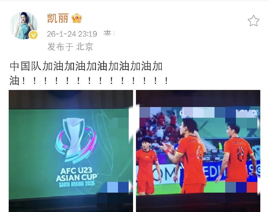 张凯丽,深夜发文! 26年1月24日深夜,张凯丽深夜发文,原来,她是为了正在进行的U23国足对战日本的关键比赛,难掩激动,在社交平台上为中国队呐喊助威。 张凯丽深夜发文的内容简短却充满力量:“中国队加油加油加油加油加油加油!!!!!!!!!!!!!! ​​​”,一连串的加油和感叹号,仿佛能透过屏幕听到她激昂的呼喊。 张凯丽深夜发文,这不仅仅是明星的简单表态,更是一位普通观众在关键时刻,与国家荣誉紧紧相连的真情流露。 张凯丽深夜发文,在这个深夜显得格外醒目,比赛牵动人心,无数人和她一样守在屏幕前,心跳随着每一次传球、每一次射门而加速。 她的呼喊,也正是千千万万中国球迷共同的心声,在这激动人心的时刻,大家都屏息凝神,期盼着绿茵场上能传来捷报,期盼着中国队能拼出风采,赢得胜利! 张凯丽深夜发文,发的是一份滚烫的期待,也是一份沉甸甸的祝福,不过无论结果如何,这份深夜的呐喊,已经为这个足球之夜,注入了更多热血与温度。中国队,加油!