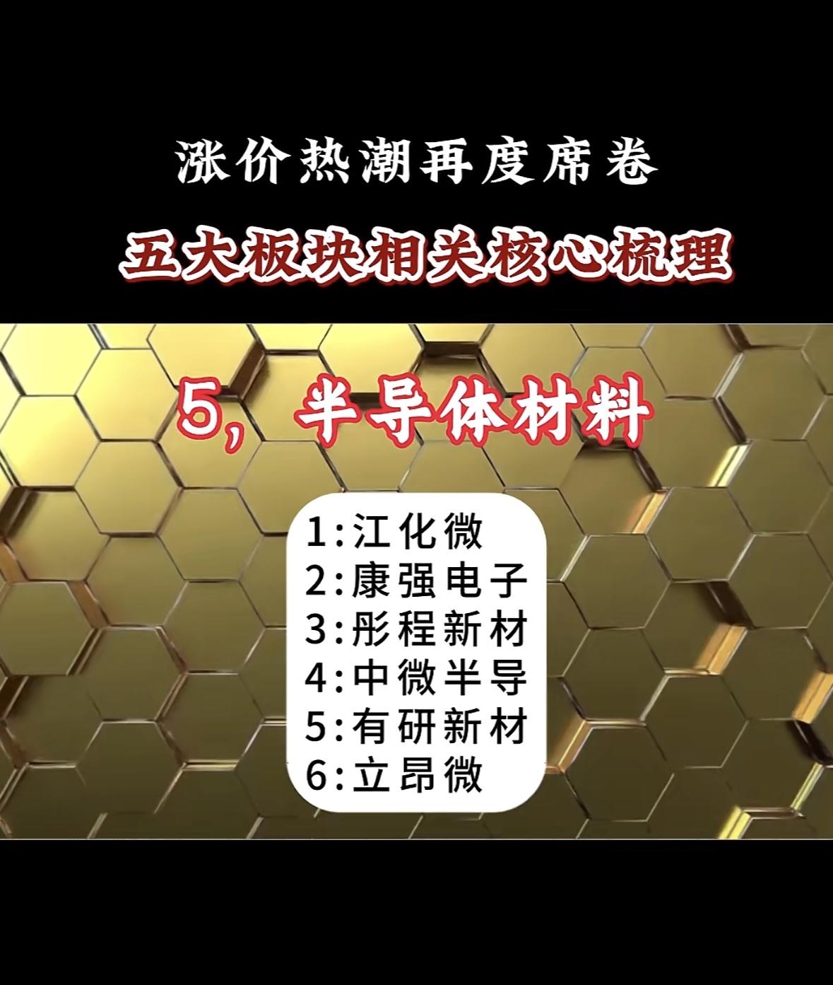 贵金属板块大涨,湖南白银、白银有色领涨,四川黄金、赤峰黄金跟风,湖南黄金、招金黄金同步攀升。 半导体材料五大龙头公司梳理,投资机会大揭秘!