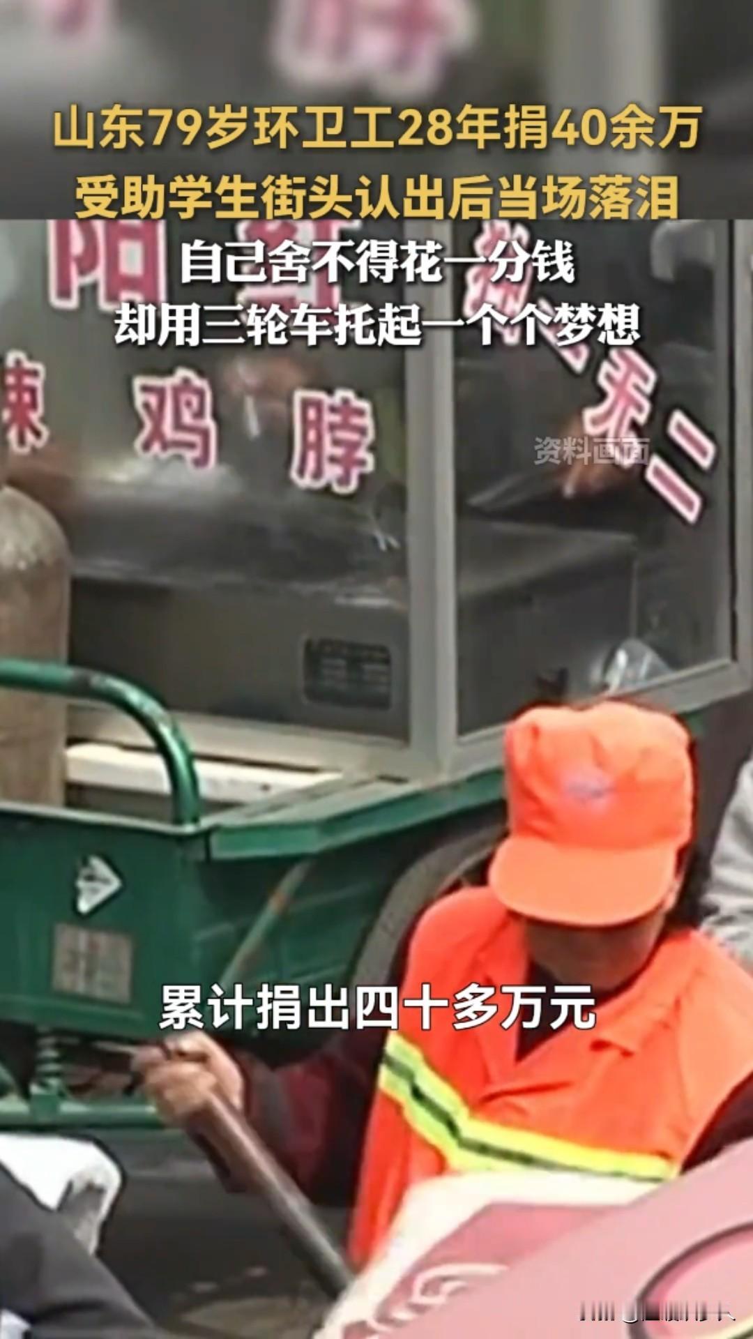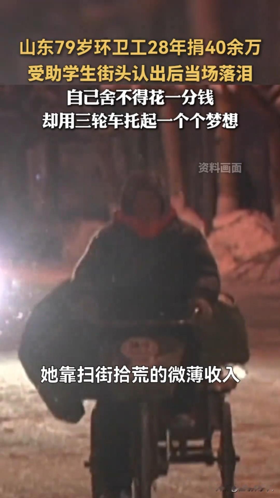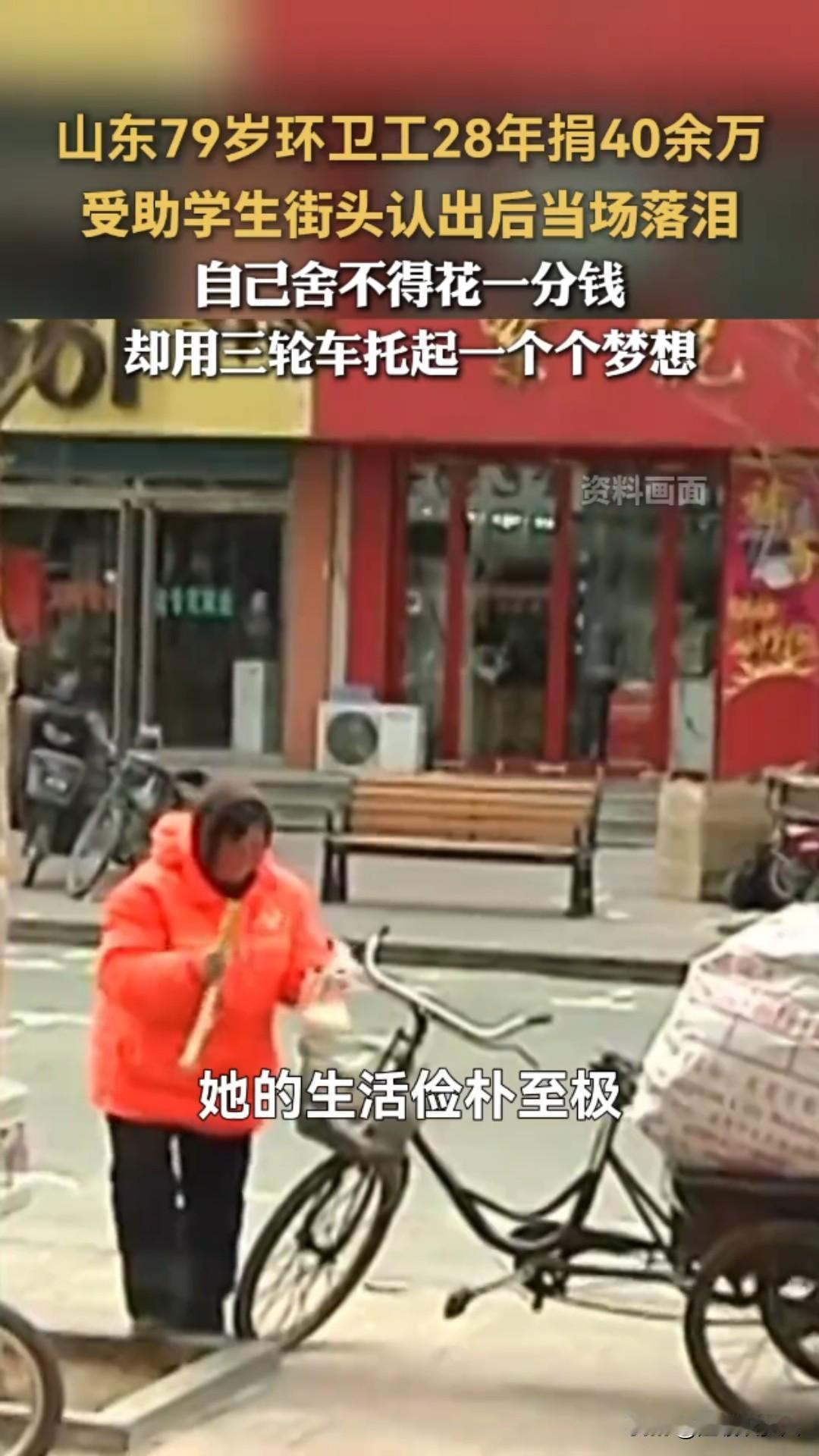79岁环卫工奶奶太戳心!28年捡废品捐40万,凉水泡饭过日子,却托起百余名寒门学子!网友感叹,这才是“感动 中国”的人物! 山东威海文登区,清晨五点的街头还浸着寒气,79岁的李玉坤奶奶,已经推着吱呀的三轮车穿梭在街巷里,车斗里码得整整齐齐的塑料瓶、旧纸箱,是她为寒门学子攒的“爱心基金”。 谁能想到,这位橘红色工装的环卫工奶奶,曾是日薪仅4元的环卫临时工,却用28年的时间,累计捐资40余万元,托起了100多名寒门学子的人生! 一切的起点,是1986年那场劫难:丈夫突患重病,7万多医疗费压垮全家,是工友凑钱、邻居送衣食、乡亲照料孩子,帮她撑过了最难的日子。一句“大家帮我,我得用一辈子还”,成了她一生的执念。 为了报恩,她拼了命地苦:凌晨3点半扫街,比规定早到2小时,一月磨秃2把扫帚,半年穿破10双布鞋;下班后佝偻着腰翻捡废品,忙时一天只吃一顿凉水泡饭;家具是捡来的,暖壶用了半世纪,床单是碎布拼的,丈夫想吃对虾,她只敢借钱买一只,全家分食半截虾身落泪。 可她的慷慨,却给了素不相识的人:1998年长江洪灾,捐出女儿备婚的棉被面料+当月200元工资(月薪仅210元);非典、雪灾、地震次次捐款,新冠疫情捐出10400元;政府给的5万养老金、社会捐赠的68500元,悉数捐出;加入“社会妈妈”助学,一资助就是二十多年。 最暖的是那个误会:受助学生小康和她通信四年,一直喊她“李伯伯”,以为是机关干部,2010年毕业相见,看到手持扫帚的老人,当场泪涌。奶奶只是拭去她的泪:“只要你有好前程,我就高兴!” 如今,百余名学子成才,有人做了公务员,有人出国深造,有人想接她养老,都被她婉拒:“你们过好日子,就是最好的回报。”79岁的她,依旧蹬着三轮车扫街、捡废品,早在2014年,她还签下了遗体捐献书:“活着帮人,走了也能再尽份力。” 网友热议:有的人一年一百万不够花,有的人一月一千多块钱,二十多年捐了四十多万!奉献与贫富无关,与爱心相连! 还有网友说:应该上感动中国,最朴素的人却干着最伟大的事! 我想说:这就是干着最脏最累的活,确有着最干净的灵魂,有着最善良的心人! 一身橘红,一生温暖。李玉坤奶奶把最苦的日子过成了光,用最朴素的坚守,把善意传递了一辈子。这才是最值得我们追的星,向奶奶致敬!环卫工阿姨 平凡人的小感慨 威海好人