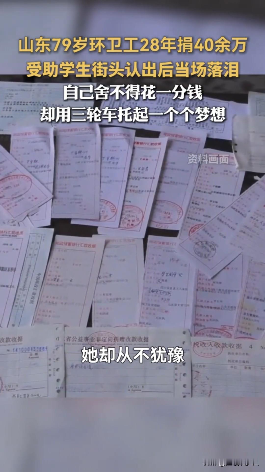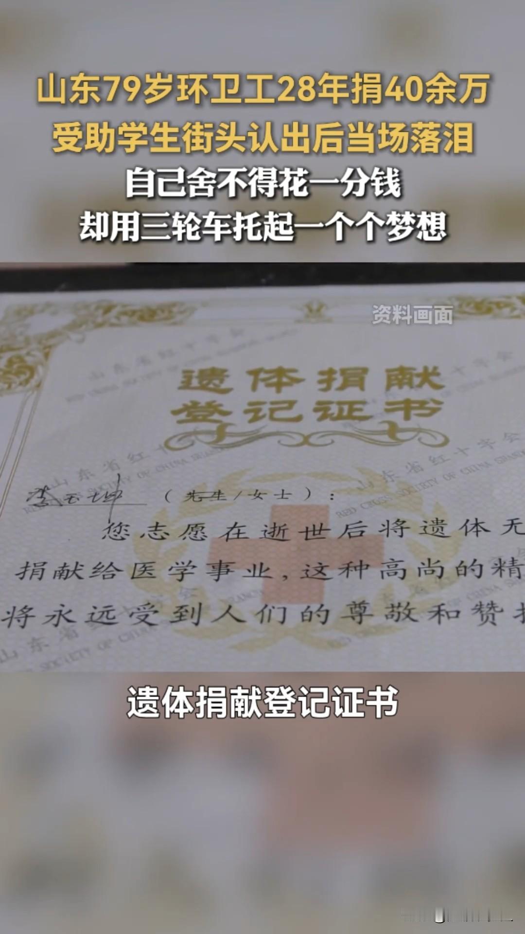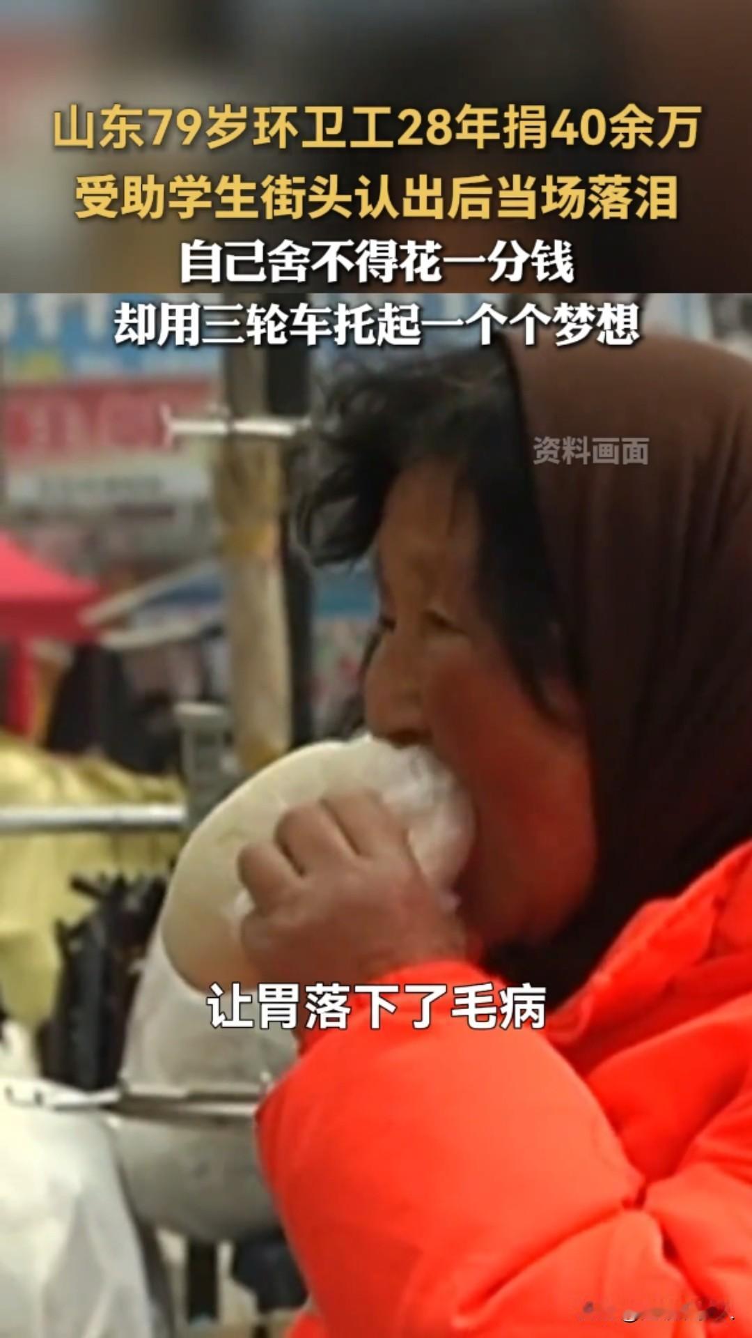 79岁环卫工奶奶太戳心!28年捡废品捐40万,凉水泡饭过日子,却托起百余名寒门学子!网友感叹,这才是“感动 中国”的人物! 山东威海文登区,清晨五点的街头还浸着寒气,79岁的李玉坤奶奶,已经推着吱呀的三轮车穿梭在街巷里,车斗里码得整整齐齐的塑料瓶、旧纸箱,是她为寒门学子攒的“爱心基金”。 谁能想到,这位橘红色工装的环卫工奶奶,曾是日薪仅4元的环卫临时工,却用28年的时间,累计捐资40余万元,托起了100多名寒门学子的人生! 一切的起点,是1986年那场劫难:丈夫突患重病,7万多医疗费压垮全家,是工友凑钱、邻居送衣食、乡亲照料孩子,帮她撑过了最难的日子。一句“大家帮我,我得用一辈子还”,成了她一生的执念。 为了报恩,她拼了命地苦:凌晨3点半扫街,比规定早到2小时,一月磨秃2把扫帚,半年穿破10双布鞋;下班后佝偻着腰翻捡废品,忙时一天只吃一顿凉水泡饭;家具是捡来的,暖壶用了半世纪,床单是碎布拼的,丈夫想吃对虾,她只敢借钱买一只,全家分食半截虾身落泪。 可她的慷慨,却给了素不相识的人:1998年长江洪灾,捐出女儿备婚的棉被面料+当月200元工资(月薪仅210元);非典、雪灾、地震次次捐款,新冠疫情捐出10400元;政府给的5万养老金、社会捐赠的68500元,悉数捐出;加入“社会妈妈”助学,一资助就是二十多年。 最暖的是那个误会:受助学生小康和她通信四年,一直喊她“李伯伯”,以为是机关干部,2010年毕业相见,看到手持扫帚的老人,当场泪涌。奶奶只是拭去她的泪:“只要你有好前程,我就高兴!” 如今,百余名学子成才,有人做了公务员,有人出国深造,有人想接她养老,都被她婉拒:“你们过好日子,就是最好的回报。”79岁的她,依旧蹬着三轮车扫街、捡废品,早在2014年,她还签下了遗体捐献书:“活着帮人,走了也能再尽份力。” 网友热议:有的人一年一百万不够花,有的人一月一千多块钱,二十多年捐了四十多万!奉献与贫富无关,与爱心相连! 还有网友说:应该上感动中国,最朴素的人却干着最伟大的事! 我想说:这就是干着最脏最累的活,确有着最干净的灵魂,有着最善良的心人! 一身橘红,一生温暖。李玉坤奶奶把最苦的日子过成了光,用最朴素的坚守,把善意传递了一辈子。这才是最值得我们追的星,向奶奶致敬!环卫工阿姨 平凡人的小感慨 威海好人