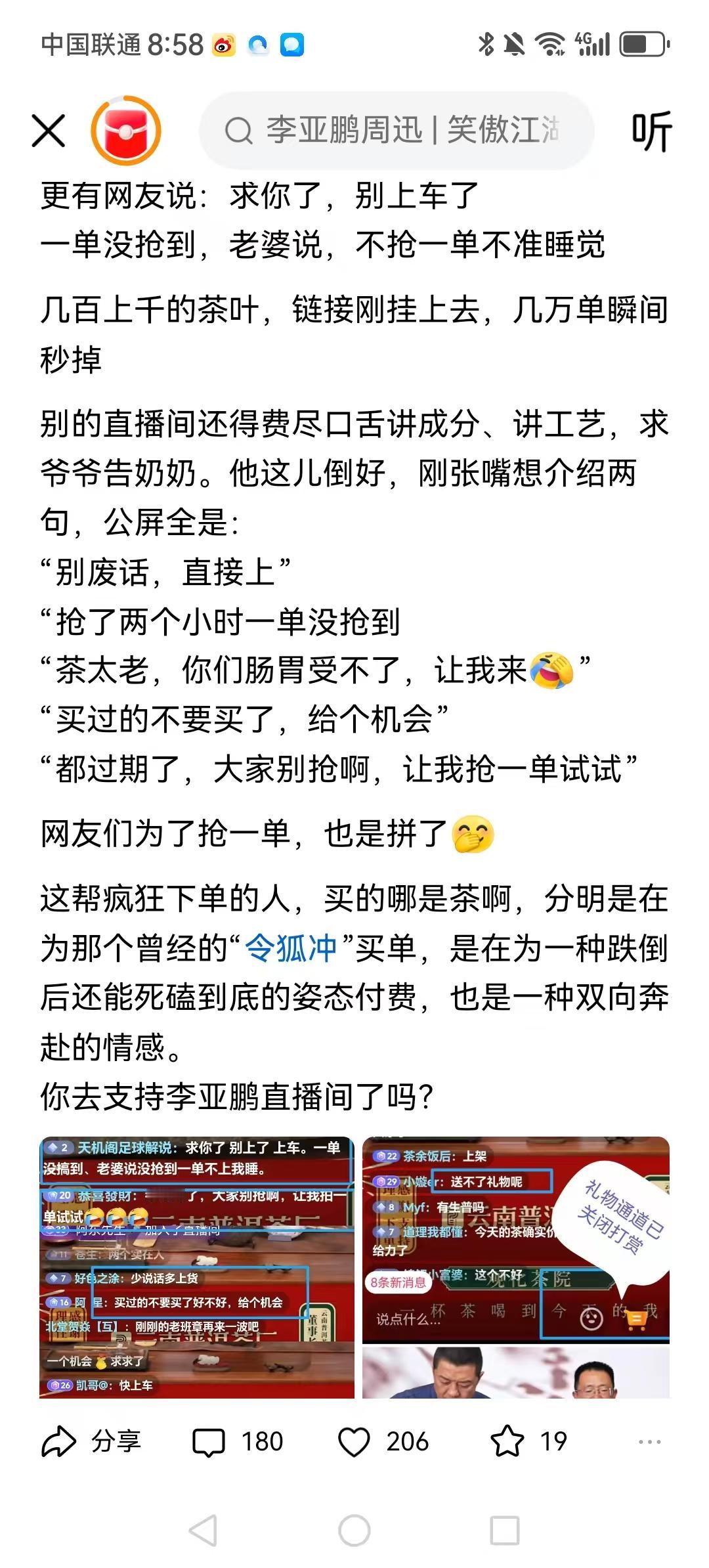 昨天晚上李亚鹏的直播间, 不仅把礼物通道关了。茶叶卖成年货榜第一,这就是来自善良人的爱,先生大爱。 昨晚一直在直播间,买了两瓶酱油,看那么多多人支持李亚鹏真的好感动。 茶抢不到,贵的不舍得买,就随便买点别的。 买的是李亚鹏的善,用这点钱去帮助更多的人,太庝那买李亚鹏的/粉丝,用心良苦,慈善不是说,是用行动来感动大家。 是啊,李亚鹏现在被大家称之为先生,这应该是对他最至高无上的称号了吧,李亚鹏您值得,您配这个称号。 他是受过多次算计被坑之后还没有灰心,对这个世界依然给予大爱的人,让这样的人活的好一点吧! 这个趋势很快成为带货全网top3,厚积薄发,应得的。