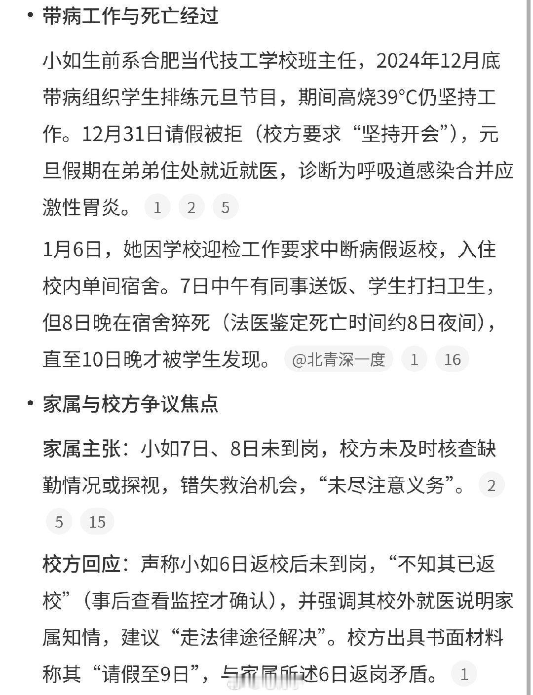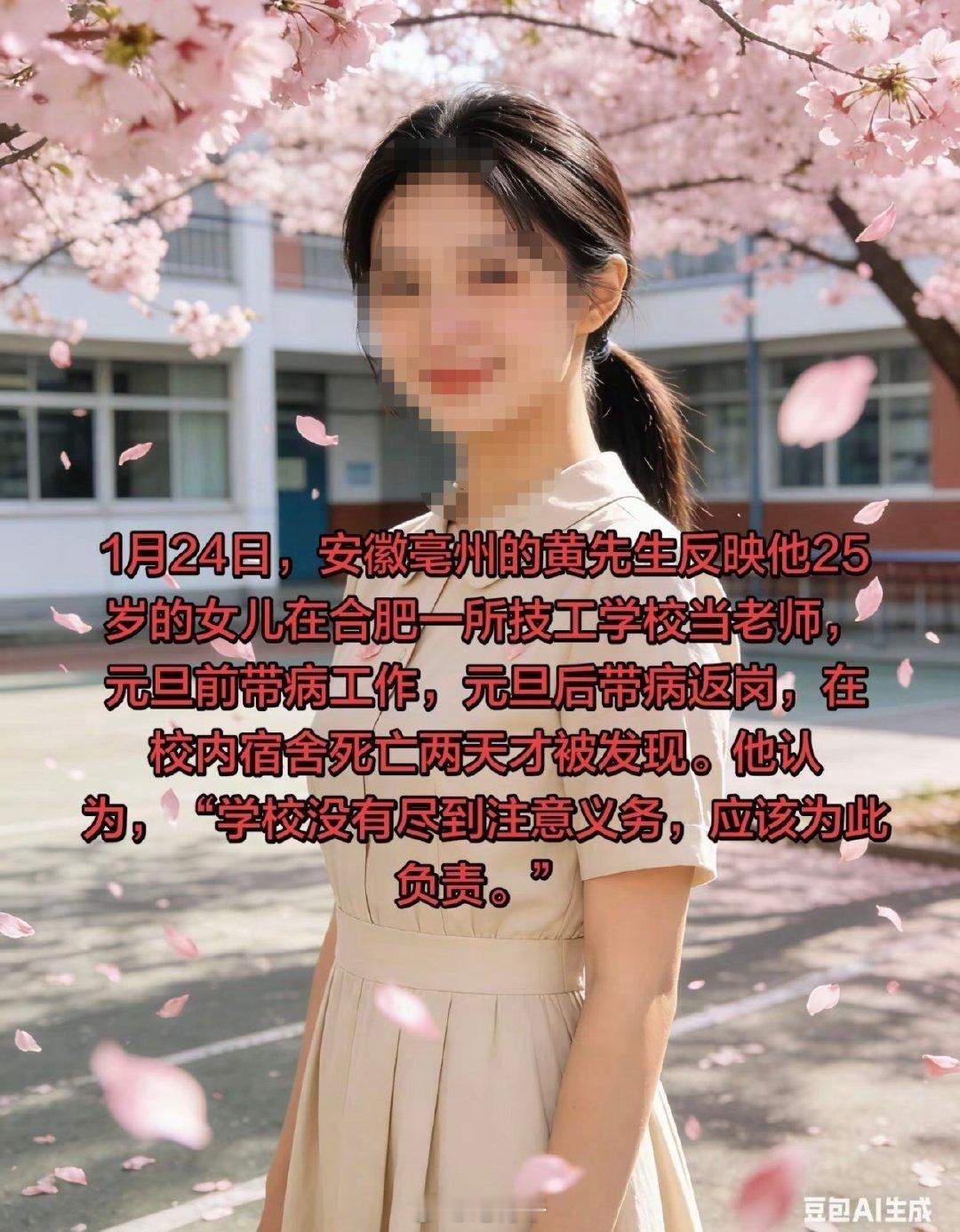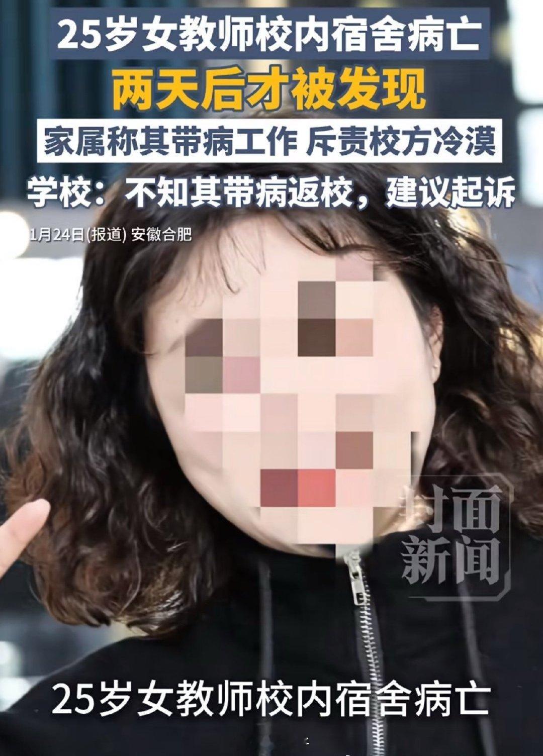 女教师校内宿舍病亡两天后才被发现这事儿听着真让人心里堵得慌。25岁的大姑娘,带病坚持工作,最后死在宿舍两天都没人发现,太凄凉了。学校一句“不知情”就想推卸责任?老师没到岗、没参会,学校居然毫无反应,这管理也太稀松了。宿舍就在校内,人两天没动静,要是学校有点责任心,查个寝、打个电话能费多大事?别总等出了人命才来说“走法律途径”,这不仅是法律问题,更是良心问题。专栏 · 乱相百态 | 社会热点 | 改开隐患专栏 · 奇闻异事奇葩事