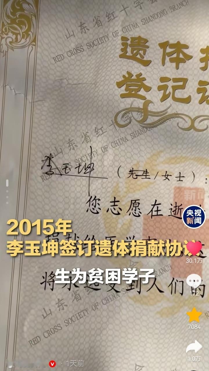 “火到央视了!”山东威海,79岁的李玉坤,正拿着扫帚扫街,谁能想到这个天天捡废品,扫大街的老人,28年里竟悄悄捐了40多万,资助了上百名贫困学生,背后的故事一曝光,让不少大老爷们都看哭了。网友:应该上感动中国! 李玉坤是山东威海本地人,干扫街的活儿干了24年。 她自己的孩子,当年没机会好好读书,她心里一直惦记着这事,就想着自己,能多帮几个,没钱上学的孩子,或者比较贫穷的孩子,这样心里也开心。 这些年,她每天天不亮就出门扫街,路上看到能卖钱的废品就捡起来攒着,一分一毛地攒,28年下来一共捐了40多万。 她每年8月份,都会特意跑去慈善总会捐款,还经常翻报纸,来找那些贫困学生,或者有困难的家庭,每一个孩子她都会主动上门去帮。 家里的抽屉里堆着一沓沓的邮政汇款收据,还有好多受助学生寄来的信,有个学生一开始在信里一直叫她“李伯伯”。 后来见面才发现,这个叫了这么久的“李伯伯”是个扫大街的阿姨,那个孩子当场就抱着李玉坤哭了,说原来以为,资助自己的是坐办公室的干部,没想到是天天风里来雨里去扫街的人。 李玉坤对自己那是真抠门,一件衣服穿了20多年,洗得都发白了也舍不得买新的,平时吃饭穿衣都过得特别朴素。 2015年的时候,她还特意去签了遗体捐献协议,说自己去世后,能为医学事业出点力也挺好。 有人夸她伟大,她却摆摆手说:“我就是做了点该做的事,没啥了不起的。”可就是这样一个普普通通的老人,用一辈子的坚持,做了件让人打心底里佩服的事。 李玉坤常年扫街,拾荒,她的手上都磨出了老茧,挣的每一分钱都带着汗水,可她全都用来帮了孩子。 她的这份心意,就像一束暖光,照亮了上百名贫困学生的求学路。 有网友说,什么叫高尚品德?这就是最高尚的品德!这就是让全国人民最尊重的人! 也有网友说:最朴素的人做最伟大的事,奶奶用扫街的钱温暖了无数人,这才是真正的人间大爱! 还有网友分享:奶奶这么大年纪还能这么硬朗,必定会健康长寿!奶奶的福报[玫瑰][玫瑰][玫瑰] 其实,李玉坤因为自己淋过雨,就想着给别人撑把伞,她知道没书读的苦,所以拼尽全力,让更多孩子能有机会改变命运。 在平平淡淡的日子里,李玉坤用28年的坚守,写下了一段最动人的大爱故事。 她的善良和坚持,就像冬天里的暖阳,不光温暖了那些受助的孩子,也让我们所有人都觉得心里暖暖的,人与人之间的善意,从来都不分高低贵贱,普通人的一份坚持,也能活出不普通的价值。