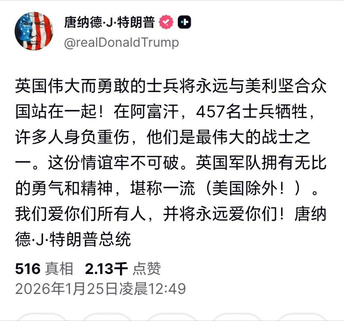 英国首相斯塔默抗议特朗普,居然成功了。特朗普达沃斯说,美国从来没有需要过北约,北约盟友向阿富汗派的兵都在后方,远离前线。 斯塔默昨天回应说,特朗普的话极具侮辱性,令人震惊,要求特朗普道歉。 英国首相府发了个声明,英军与美军并肩持续作战,特朗普低估了包括英军在内的北约部队在阿富汗战争中的作用。 结果,短短几个小时后,特朗普还真道歉了。或者说,服软了。不过,只向英国服软,夸了一通派驻阿富汗的英国士兵。