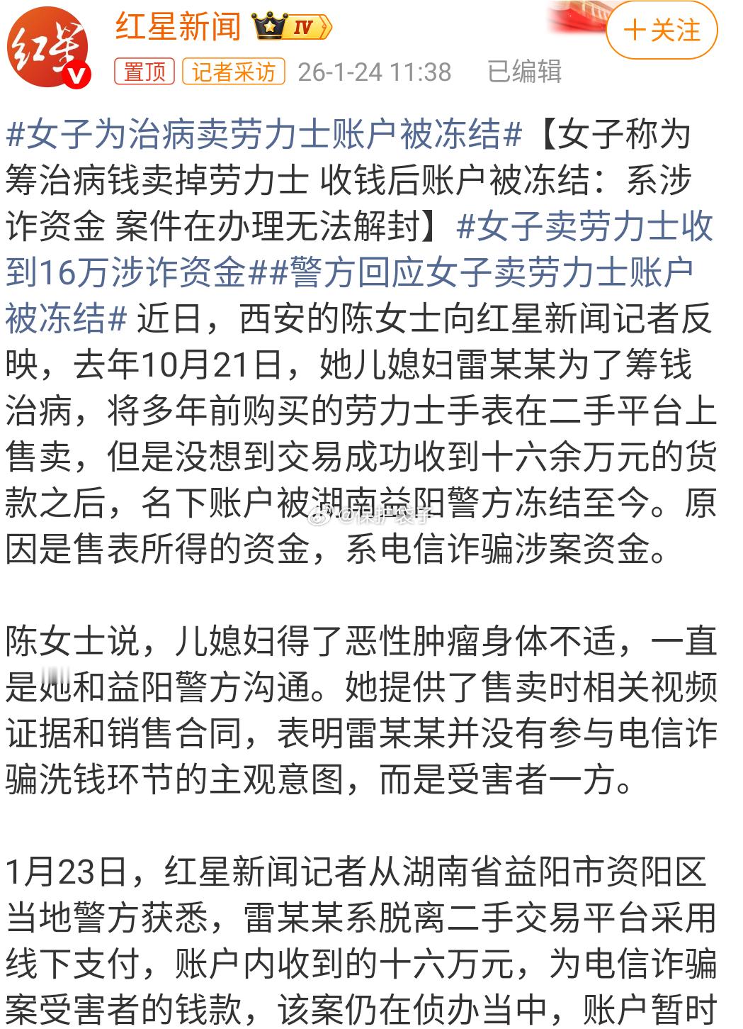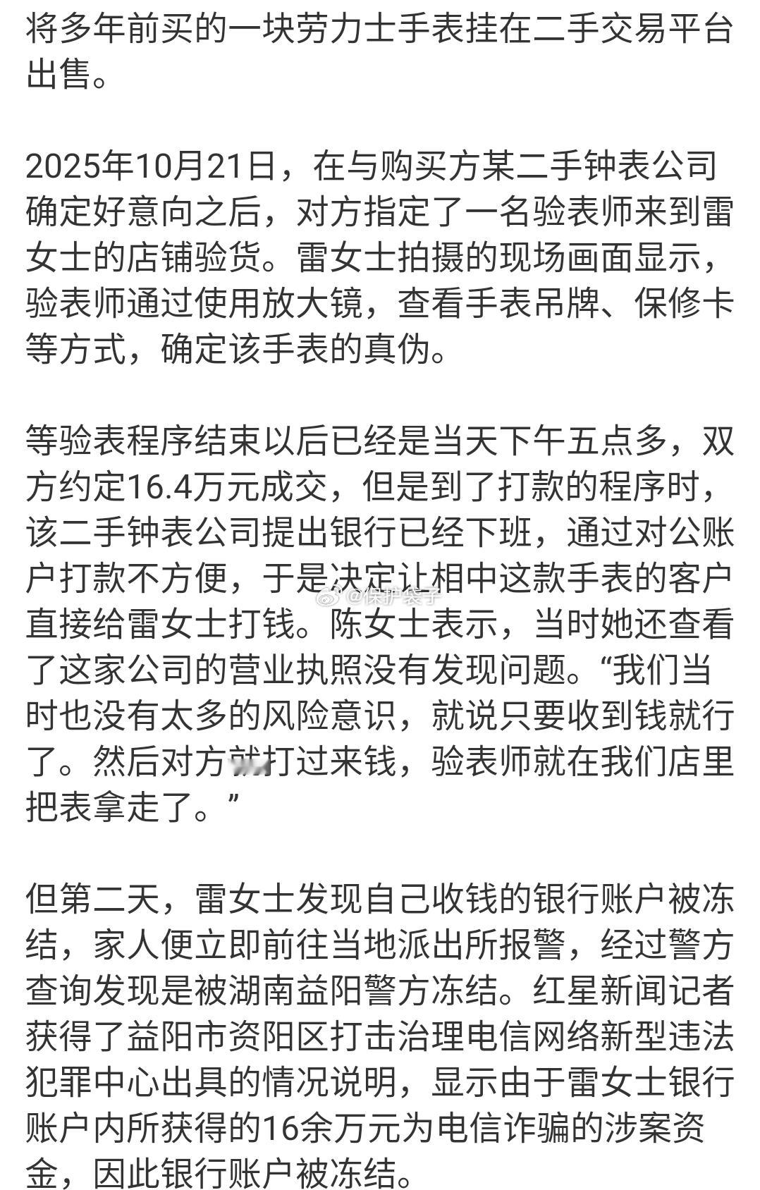 女子为治病卖劳力士账户被冻结看看某星的内容,再看看别人,要努力做值得信任的媒体啊。尽管对女士身体情况表示同情,但是既然上了平 台却绕开?就算钟表公司有“银行下班“的理由就隔一个晚上那么迫不及待?或者网银这个词就那么陌生,——基本都是大额度来往的钟表公司连个网银都没有这是在开玩笑?!或者干脆这二手钟表公司就有意无意的也沾了一点点?袋子时评