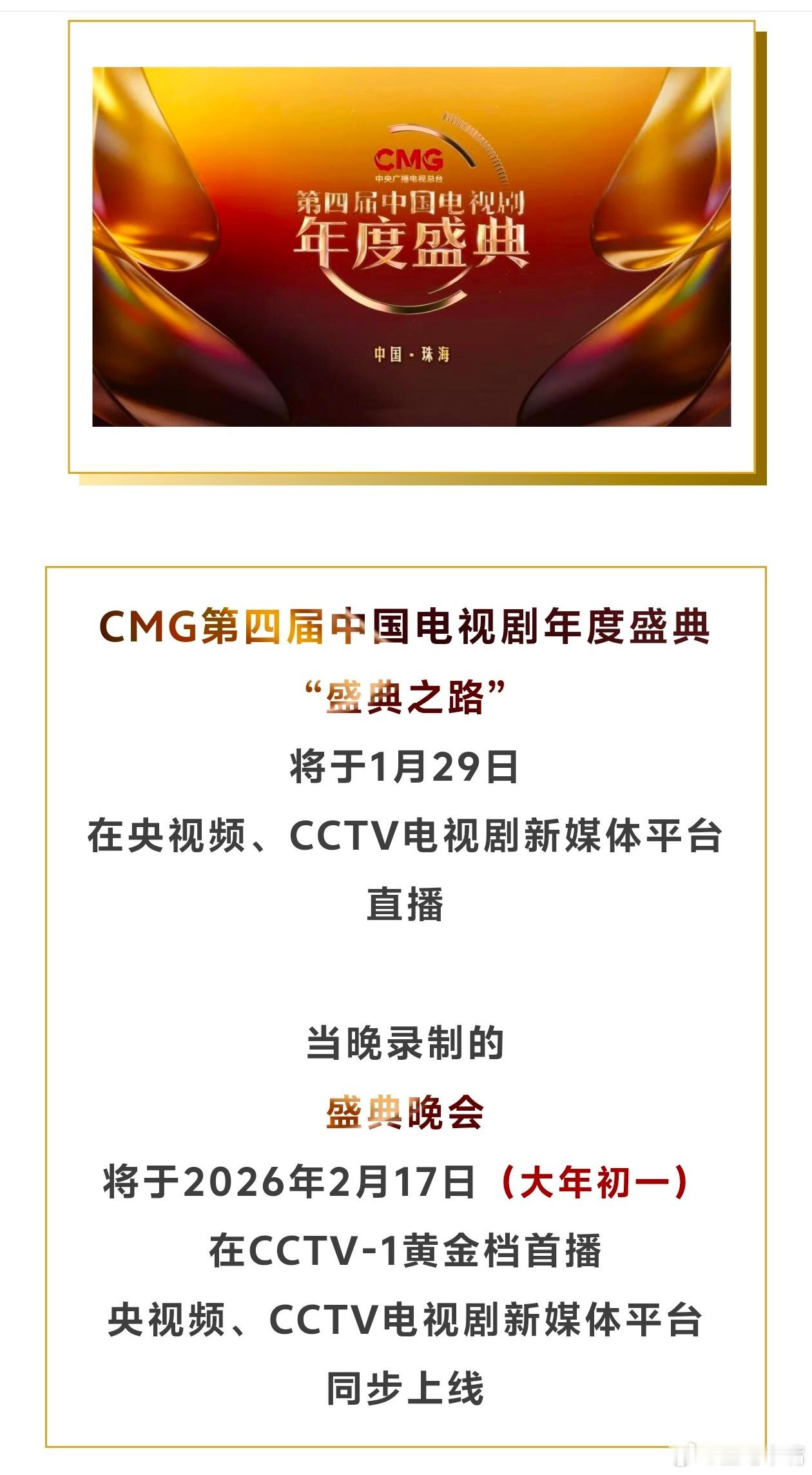 第四届中国电视剧年度盛典官宣1月29日录制:央视频等各大新媒体直播2月17日初一:央一黄金档播出!(央八预计初四播,因为初三生命树收官!初四播正好,然后初五新剧!)