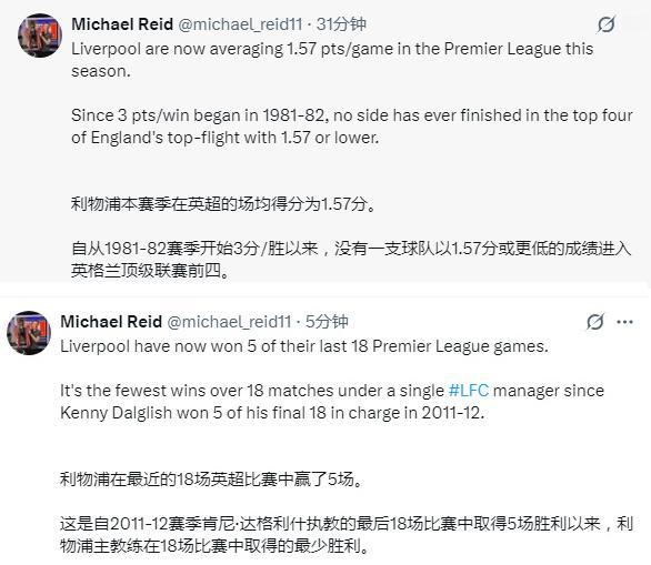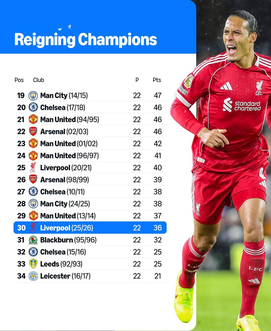 赛前只有4支英超卫冕冠军的22轮总积分低于本赛季的利物浦