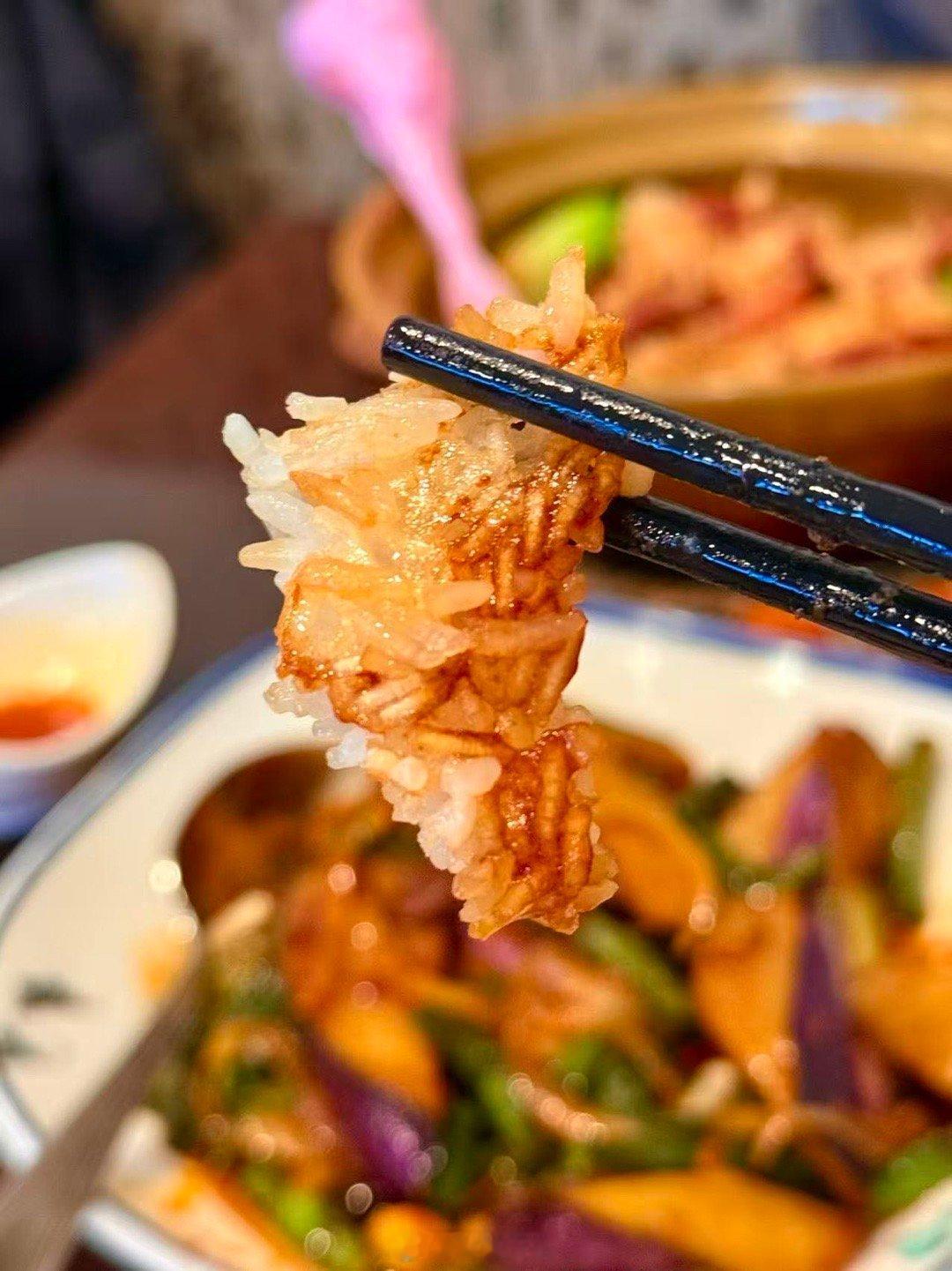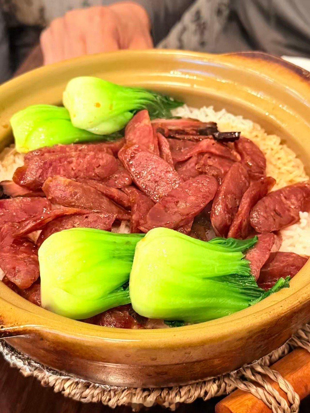 今日午餐:港式煲仔饭、烤鸭、四季豆茄子。