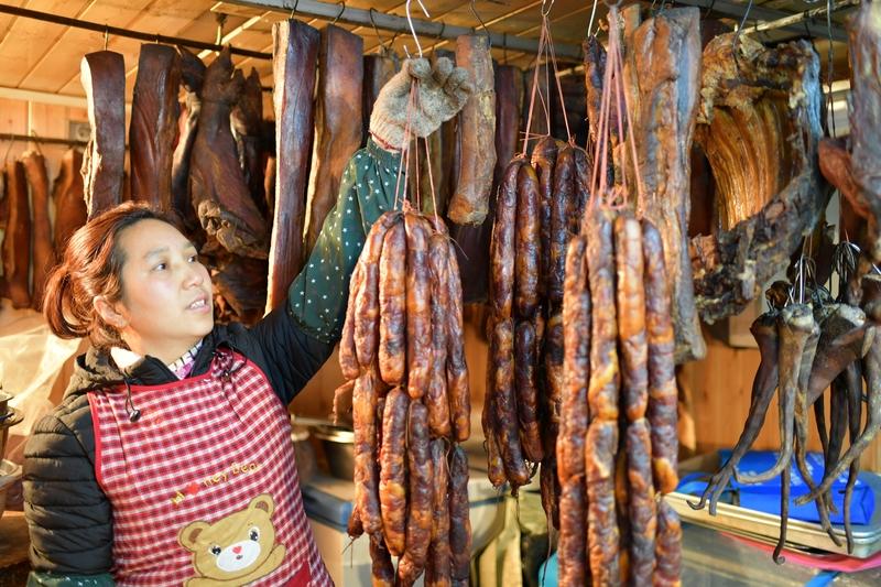 山东省诸城市龙城年集 长街人聚货嶙峋, 腊味盈空岁转轮。 鲙落银刀飘玉屑, 羊悬铁钩镀金身。 椒芹排阵红偕翠, 联对流光墨映新。 爆竹彻宵融雪夜, 满城灯暖万家春。