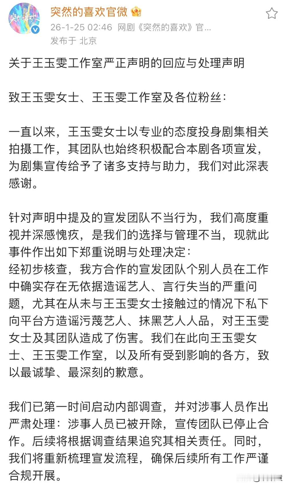 王玉雯这件事情,说到底就是剧火了,剧方飘了! 《突然的喜欢》能火,王玉雯的角色占九成功劳,王玉雯发片段宣传,也是敬业所在! 合作平台问为啥发? 或许是不知情,可能有剧透疑问,这是正常的! 但剧方宣发部表示,她自己发的。就甩锅了,也是情商低的回应! 最后王玉雯工作室的强硬回应,也是维护艺人的正确方法!