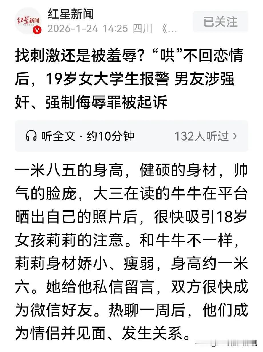 在南宁西塘的烟火人间,有一段令人扼腕叹息的爱情故事,犹如春花秋月般美丽,却也藏着阴影与痛苦。19岁的她,青春如火,正值大一的朝气蓬勃,却在网络的虚拟世界中遇见了那个帅气的大三男生。初见如同“柳暗花明又一村”,一周的甜言蜜语,仿佛春风拂面,让人心生向往。 然而,人生如戏,爱情更是变幻莫测。男生在校外租了公寓,似乎以为爱情可以用“海枯石烂”来维系。女生常住其中,梦想着“天长地久”。但天有不测风云,男生发现女友劈腿,情何以堪?于是,他提出分手,犹如“刀山火海”,让少女心碎如麻。面对分手,她舍不得放手,甘愿接受男生的“惩罚”。烟头烫、吞痰液、排泄物……这些荒诞的“游戏”,像极了“刀尖舔血”的折磨。 在情感的迷雾中,她试图挽回那曾经的“鸾凤和鸣”,却发现“山重水复疑无路”。最终,双方关系再次破裂,她在绝望中选择报警,声称自己遭遇强奸。男生辩称两人只是在“情侣之间的游戏”,自愿无强迫,似乎试图用“纸上谈兵”来掩盖真相。 法律的天平终究会为正义而倾斜。男生被警方拘捕,面对法律的“雷霆万钧”。而女生在接受了男方家长7万元的赔偿金后,出具了谅解书,似乎希望用“感恩之心”化解一切。但正如古语所云:“天网恢恢,疏而不漏。”法律的审判不会因为一纸谅解而偏袒任何一方。 这段故事告诉我们:真正的健康,是内外双调的身心健康。青春如花,须用“心宽体胖”之态呵护;爱情如酒,须用“清心寡欲”之心品味。传播正能量,勿让“虚拟的繁华”蒙蔽了“真实的幸福”。我们要感恩生命,珍惜当下,用“健康第一”的理念,去迎接每一个美好的明天。毕竟,人生如行路,唯有“心怀感恩,健康同行”,才能走得更远、更宽、更精彩!