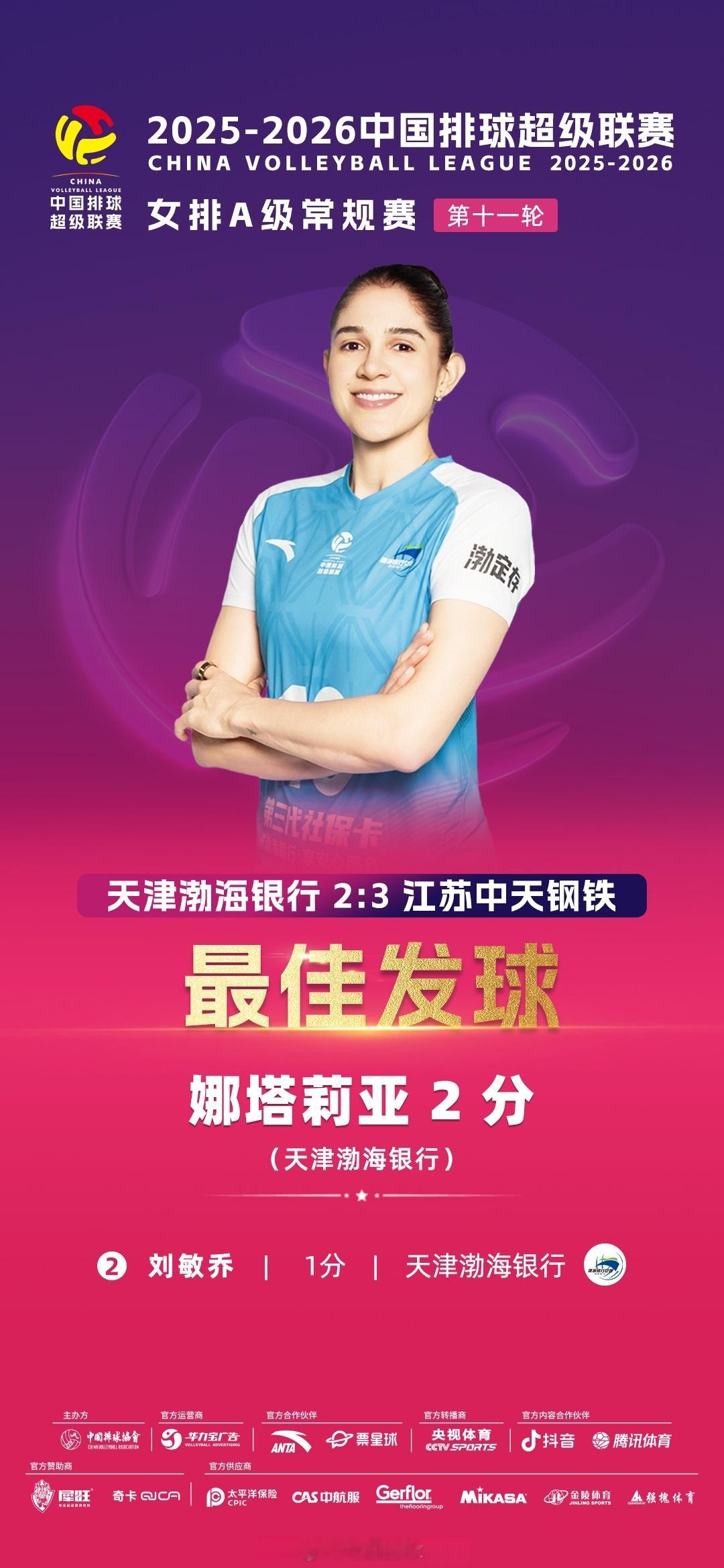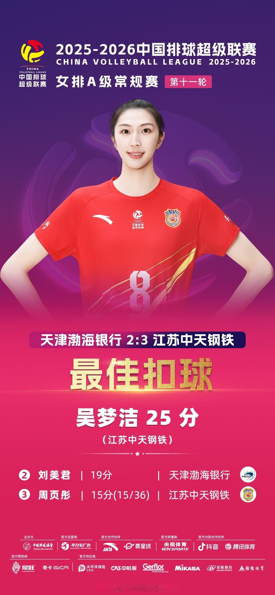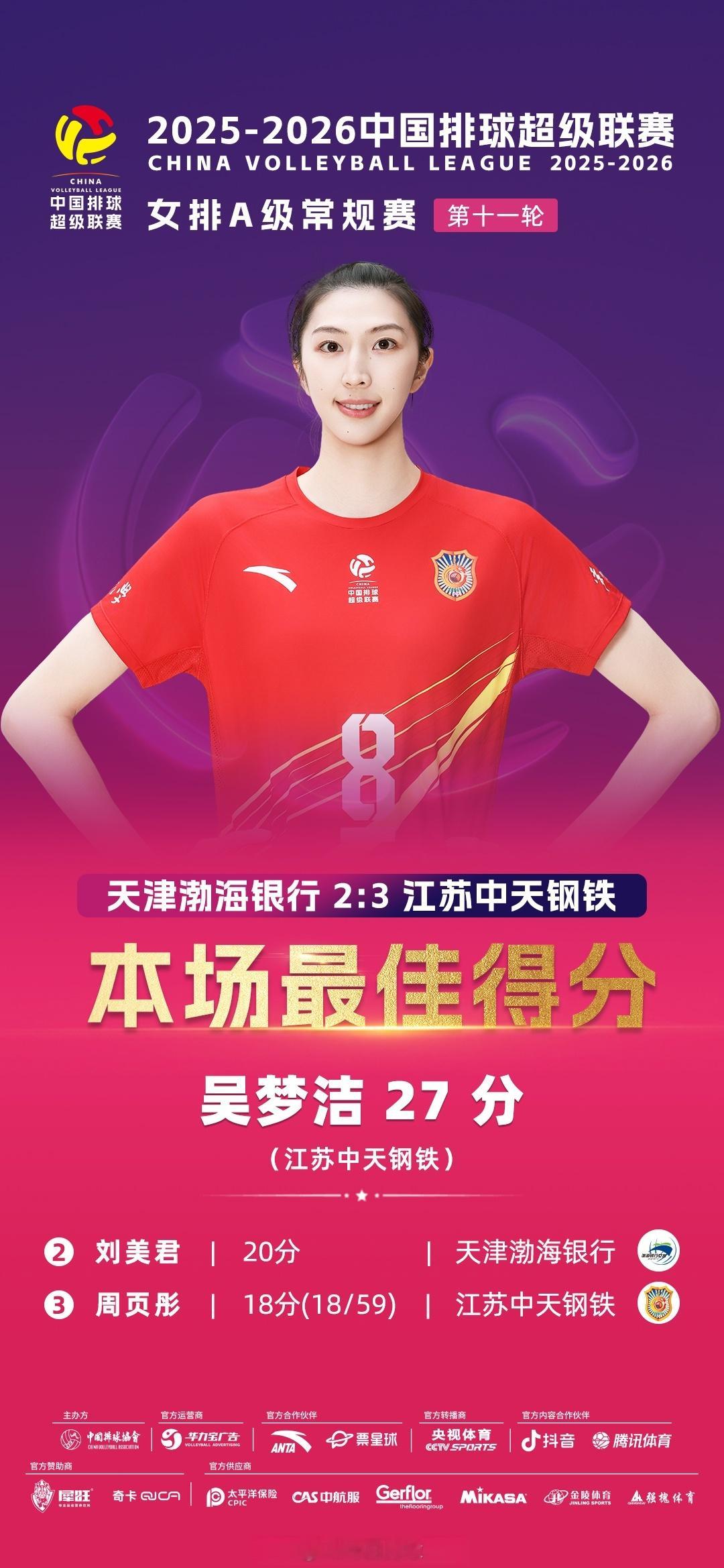 2025-2026中国女排超级联赛 A级常规赛第11轮焦点战 天津渤海银行2-3江苏中天钢铁 之“本场最佳”——最佳得分:吴梦洁(江苏中天钢铁)27分 最佳扣球:吴梦洁(江苏中天钢铁)25分 最佳拦网:周页彤(江苏中天钢铁)3分 最佳发球:娜塔莉亚(天津渤海银行)2分跃见你我