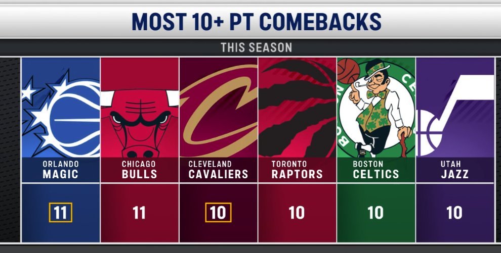 ▲本赛季逆转赢球的大户们▲魔术和公牛最多:11次NBA