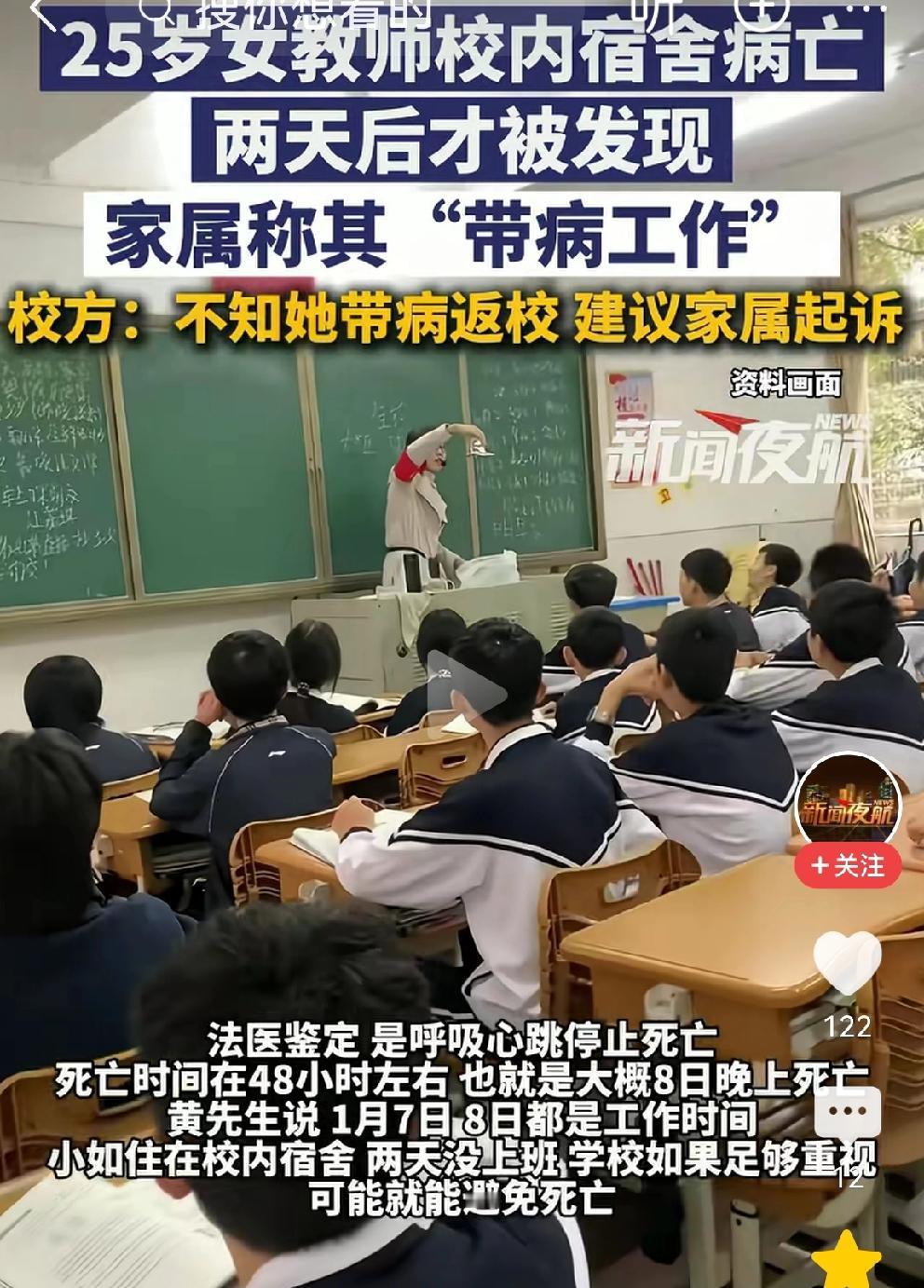 年轻的老师死在学校,学校回应太冷漠! 据死者父亲讲述: 小如老师,是合肥当代技工学校的老师。 元旦前有病回家,请假两天。6号学校通知返岗,理由是“迎检”,小如带病返岗。 小如老师住在学校里面,两天没有上课。学生们到宿舍找老师,发现老师已经死亡。 法医鉴定:是呼吸心跳停止死亡,死亡时间在48小时左右 小如,年仅25岁,生命永远定格在新年的第一个工作日。 她死在学校的教工宿舍里,两天没有人发现…这学校太冷了 小如走了,学校回应更冷漠: 校方并不知道她带病返校,“建议家属起诉解决”。 @莲之心事zpl 学校是培养人的地方,应该多一点对生命的关照和人文关怀。 人死不能复生,学校领导好好说话,安慰父母痛失爱女的心,不会吗? 一句冷冰冰的官话,寒了老师的心! 小如老师,一路走好,但愿天堂的路上不会遇到这样没有人味儿的校长[祈祷]