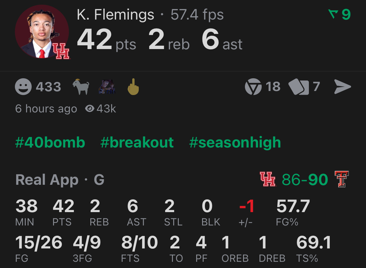 迪班萨43分 杨百翰新生得分纪录瓦格勒46分 伊利诺伊新生得分纪录(三分11中9!)弗莱明斯42分 休斯敦新生得分纪录三个新生40+发生在同一天,已经有人在说26届新秀的质量可以在历史上排得上号了NCAA