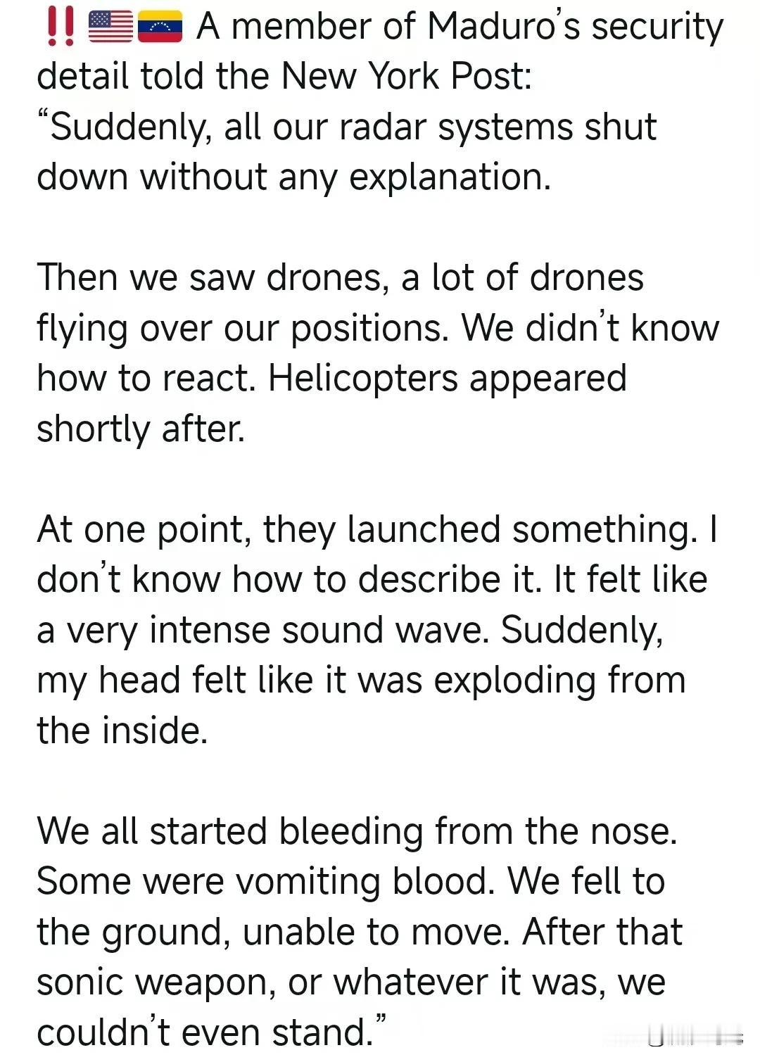 美国总统特朗普告诉《纽约邮报》,一种他称之为“混乱制造器”(Discombobulator)的秘密新武器,在上个月突袭委内瑞拉首都加拉加斯并成功抓获总统尼古拉斯·马杜罗的行动中发挥了至关重要的作用。特朗普在椭圆形办公室接受独家采访时表示,这种神秘武器“使(敌方)装备失效”,但他被禁止谈论此事。 马杜罗的一名安保人员告诉《纽约邮报》:“突然间,我们所有的雷达系统都无故关闭了。”然后我们看到无人机,很多无人机在我们上空盘旋。 我们不知道该怎么办。 不久之后,直升机也出现了。 突然,他们发射了什么东西。 我不知道该怎么形容。 感觉像是一股非常强烈的声波。 突然间,我感觉我的脑袋好像从里面爆炸了一样。 我们所有人都开始流鼻血。 有些人甚至吐血。 我们倒在地上,动弹不得。 在那道声波武器,或者不管那是什么之后,我们连站都站不起来。