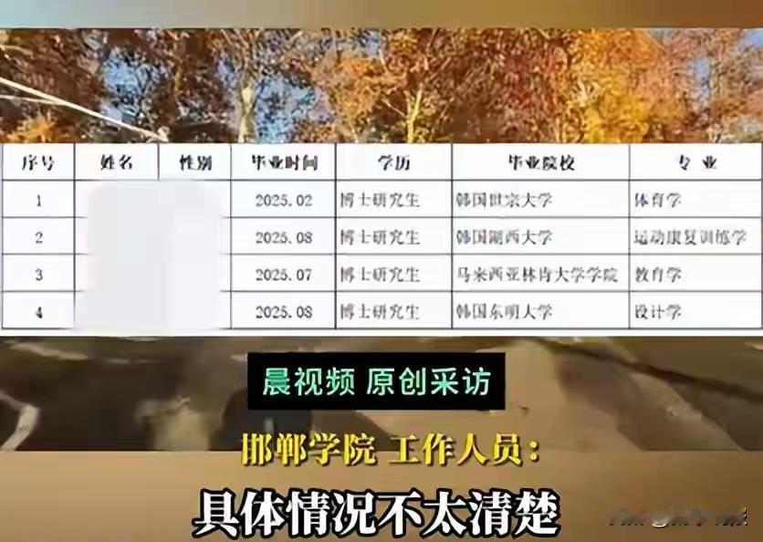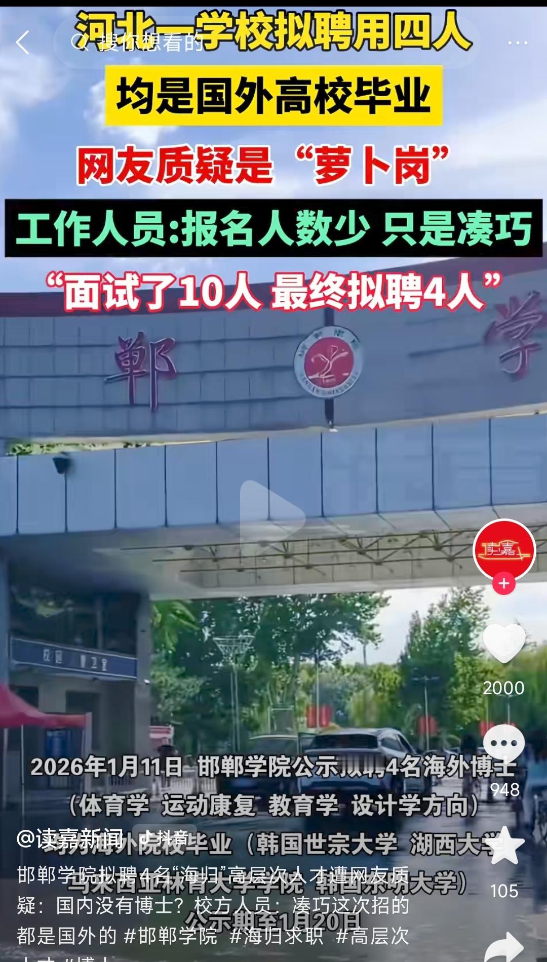 少爷们回来了!邯郸学院,招聘高层次人才,最后招来四个韩国、马来西亚水博…… 一看,这几所大学实力水平相当于国内职业院校。再一看,学体育、教育、设计的……这几个录取的博士,当年未见得能考上邯郸学院。 邯郸学院狡辩,程序完全合规,就10个人报名,碰巧要了这四个…… 咱就说,就现在这就业形势,不是萝卜岗,早就抢破头了!985、211的博士一大把!怎么就这么巧,才10个人报名,刚够1:2的条件? 说白了,就是凌晨在网站犄角旮旯贴个招聘公告,然后接着撤回,不是内部人根本看不到! 都2026年了,还有人敢搞这种萝卜坑,不严查有关人员不足以平民愤!