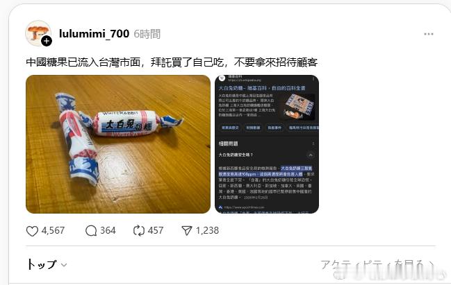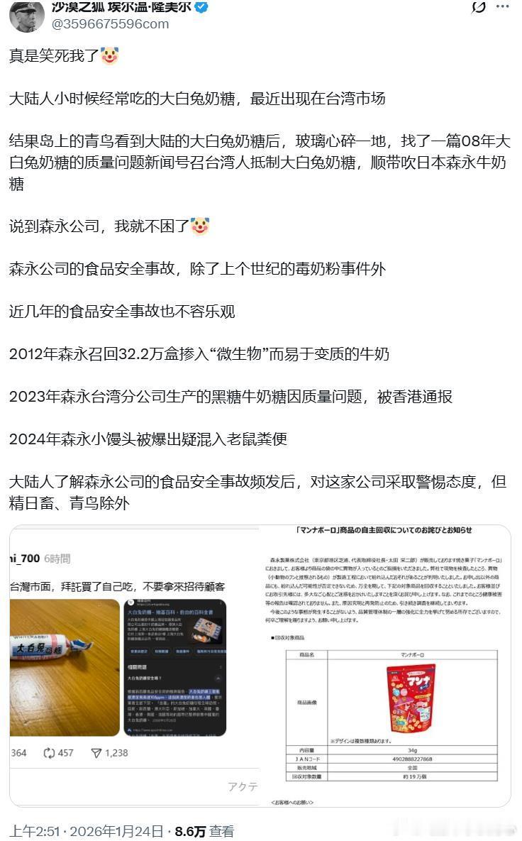 大陆人小时候经常吃的大白兔奶糖,最近出现在台湾市场。结果岛上的青鸟看到大陆的大白兔奶糖后,玻璃心碎一地,号召台湾人抵制大白兔奶糖,顺带吹日本森永牛奶糖。森永的话,我记得森永的女婿被前日本海自队员当众处决了吧。