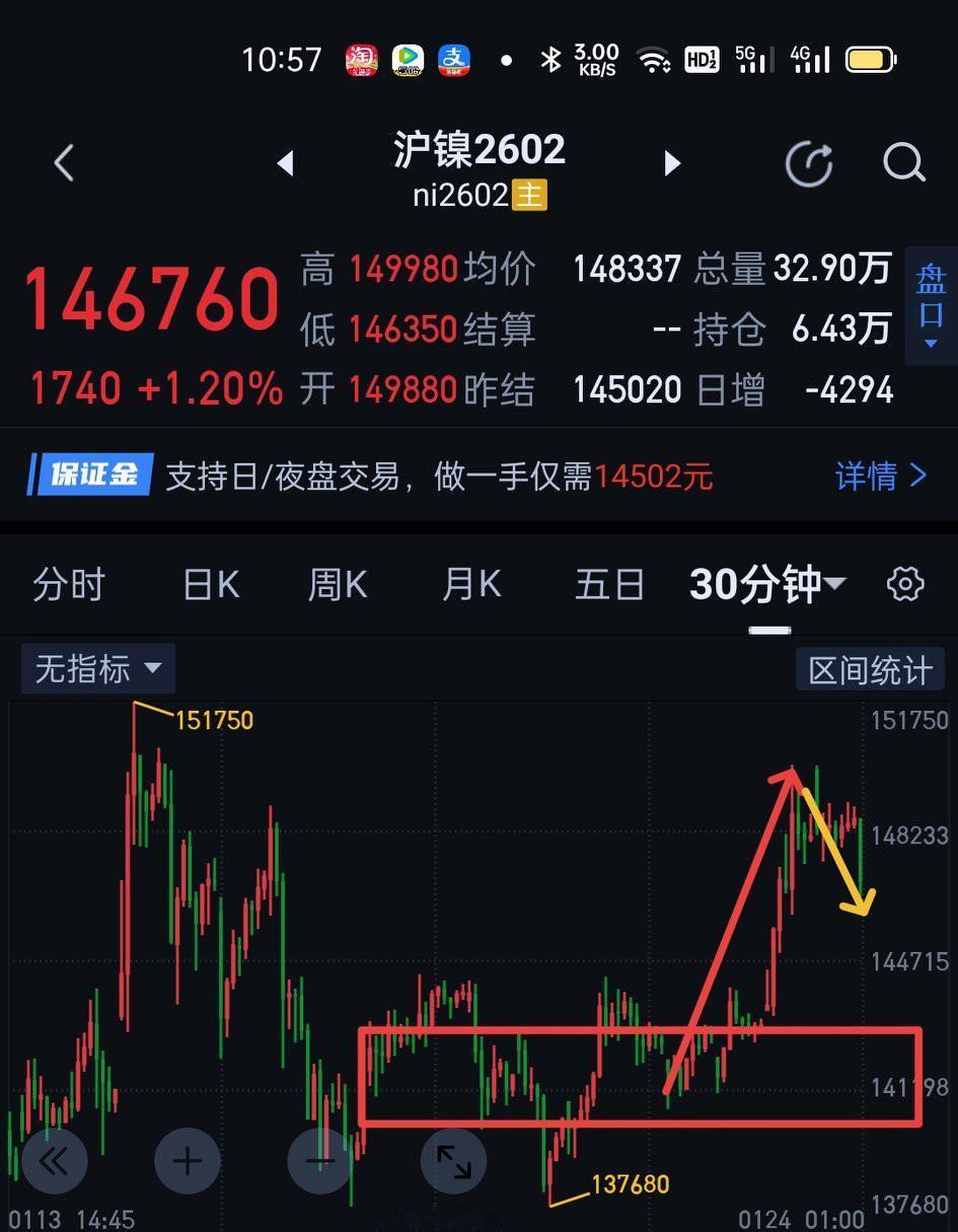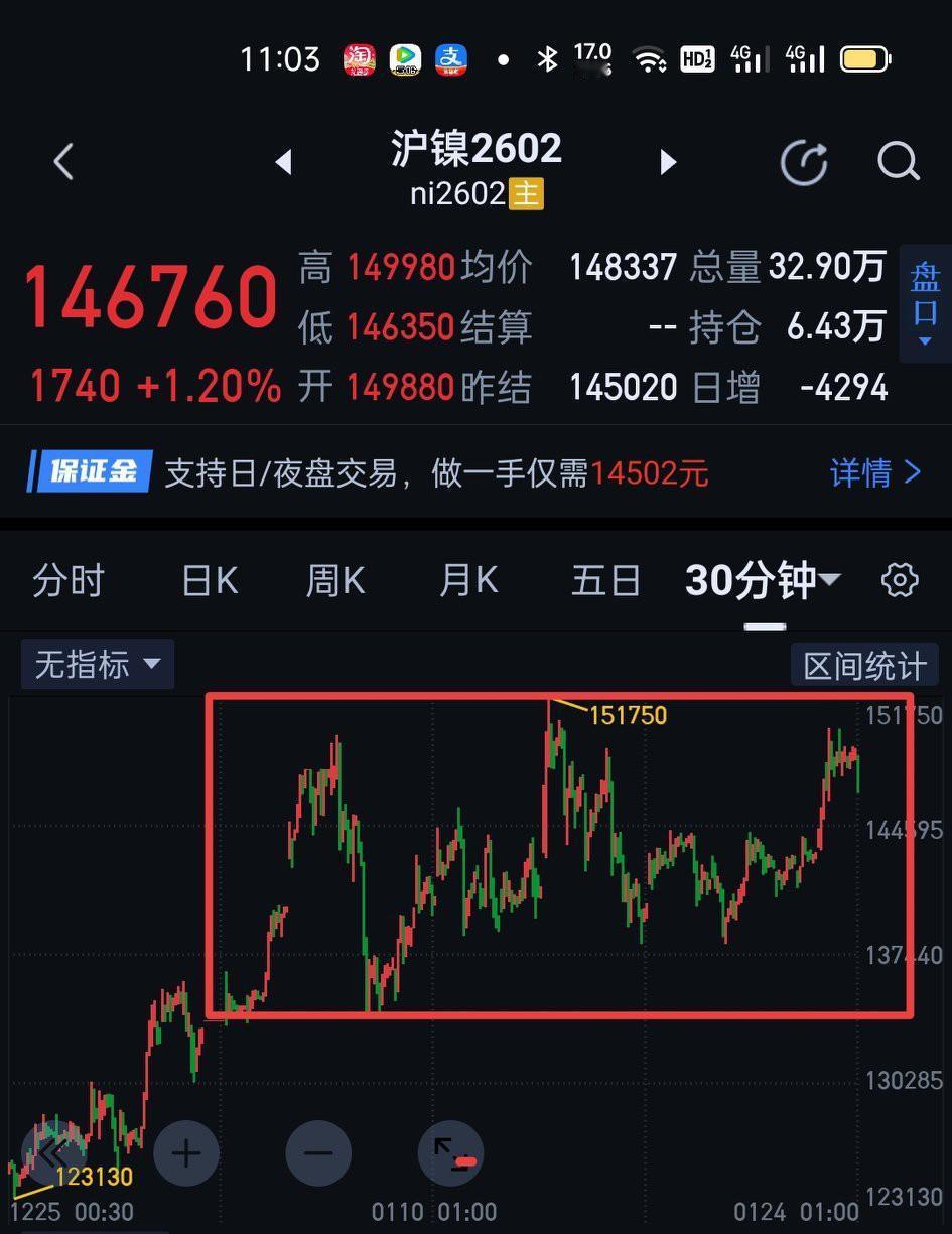 沪镍2602,周五夜盘由于147230的破坏,随之展开了三十分钟一笔下的生长。后市147230能否有效站稳是形成新的上升结构的关键。细节上,周一可观察围绕图〈1〉的一分钟是否形成盘整背驰。如形成盘背,围绕图〈2〉五分钟中枢的三买有望形成。如不能形成盘背,耐心等待三十分钟一笔下完成。站在三十分钟图上整体看,本周的走势仍是围绕图〈3〉的区间震荡。下周新的时间窗口将有助力于沪镍突破该区域的震荡。不要试图去预测最终方向选择,这是上帝的事,只需根据结构,做出该有的应对。他强任他强,清风拂山岗,他横随他横,明月照大江。