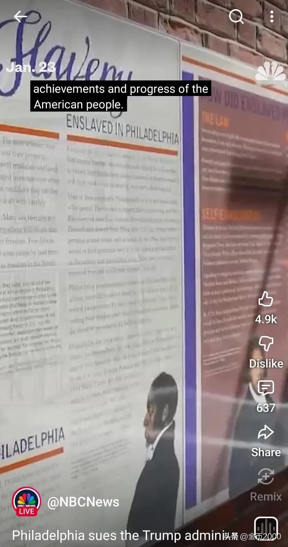 据NBC报道,费城一个独立博物馆中有关奴隶制的展览内容被撤销,费城市就此起诉特朗普政府。费城认为其撤销原因是特朗普签署了一个行政命令,禁止在国家公园等处展示含有诽谤(disparage)美国现实或历史的内容,而是要求宣传“美国人民取得的成就和进步”。[捂脸]