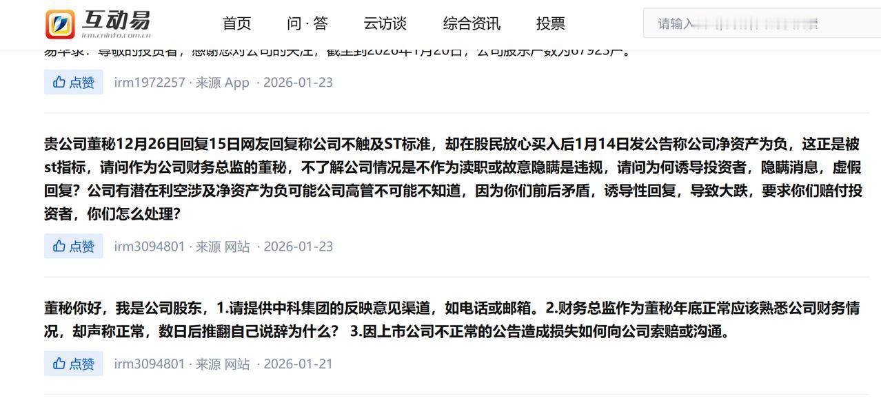这两条消息其实23号放出来的问询时间早于21号,因为投诉互动易包庇才后边显示的,但在同花顺等软件均看不到,有意思的是同样互动易提问,易华录董秘回复说不会被st,其他APP都能看到,不知道是不是董秘或互动易及APP等联合炒家利益输送故意做的局,不管怎样,如果查起来,董秘的过错免不了。 一家公司的财务或财务总监年底不了解公司的财务大体状况及可能巨大改变暴雷风险项目,放哪个公司也说不过去的,坐等结果
