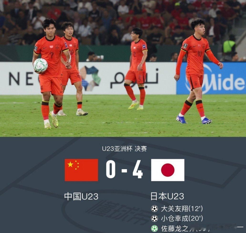 U23国足0比4日本队中国0-4日本获U23亚洲杯亚军,杨希进球被吹,李昊多次扑救U23亚洲杯决赛,日本U23对阵中国U23。日本队大关友翔、佐藤龙之介分别破门,小仓幸成双响,中国队杨希进球被吹。最终中国0-4日本历史首次夺得U23亚洲杯亚军。