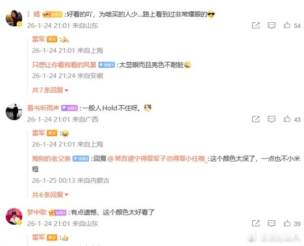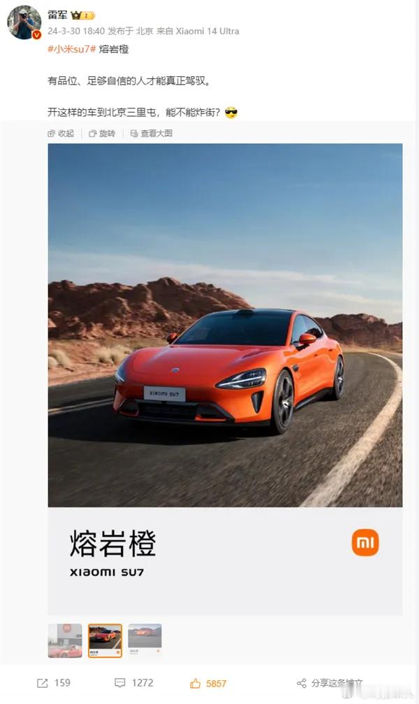 雷军称小米汽车熔岩橙配色敢买的人太少下架就绝版了! 估计熔岩橙二手车得涨价一波儿了……感觉这和文化有关系,国内消费者普遍都是黑白灰,除了超跑和那种纯玩乐属性的车,都不愿意选择太扎眼的,文化偏向内敛低调保守,成年人对稳重成熟有一种天然的信任感,其实选择一个炸眼的颜色也不代表这个人就不成熟稳重,但是我们普遍的文化赋予人的感觉就是骚和稳重不共戴天,所以导致非主流颜色的二手车保值率普遍比同款车型的黑白色更低……但是这对小米这种新势力来说就是必经之路,在和汽车市场消费者打交道的过程中会逐渐更懂用户和市场。雷军回应下架小米汽车熔岩橙配色小米汽车