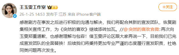 突然的喜欢已完成宣发团队全面替换突然的喜欢全面替换宣发团队 再再发文↓突然的喜欢官微:目前我们已完成宣发团队的全面替换!