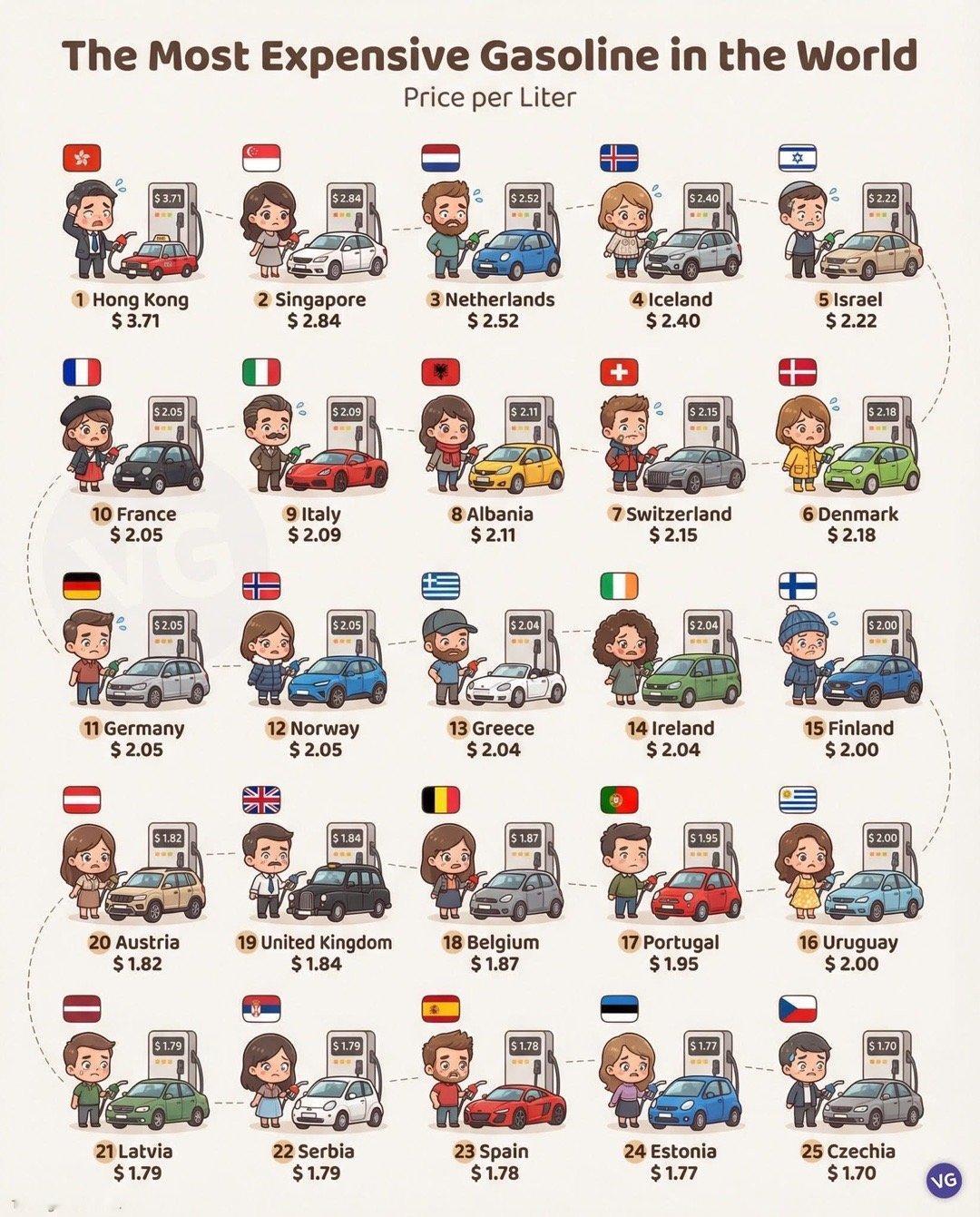 世界上汽油最贵的国家/地区 每升价格(美元)1. 中国香港 - 3.71 美元2. 新加坡 - 2.84 美元3. 荷兰 - 2.52 美元4. 冰岛 - 2.40 美元5. 以色列 - 2.22 美元6. 丹麦 - 2.18 美元7. 瑞士 - 2.15 美元8. 阿尔巴尼亚 - 2.11 美元9. 意大利 - 2.09 美元10. 法国 - 2.05 美元11. 德国 - 2.05 美元12. 挪威 - 2.05 美元13. 希腊 - 2.04 美元14. 爱尔兰 - 2.04美元15. 芬兰 - 2.00 美元16. 乌拉圭 - 2.00美元17. 葡萄牙 - 1.95 美元18. 比利时--1.87 美元19. 英国 - 1.84 美元20. 奥地利--1.82 美元21. 拉脱维亚 - 1.79 美元22. 塞尔维亚 - 1.79 美元23. 西班牙 - 1.78 美元24. 爱沙尼亚 - 1.77 美元25. 捷克 - 1.70 美元这几个国家电动化率都不低冷知识