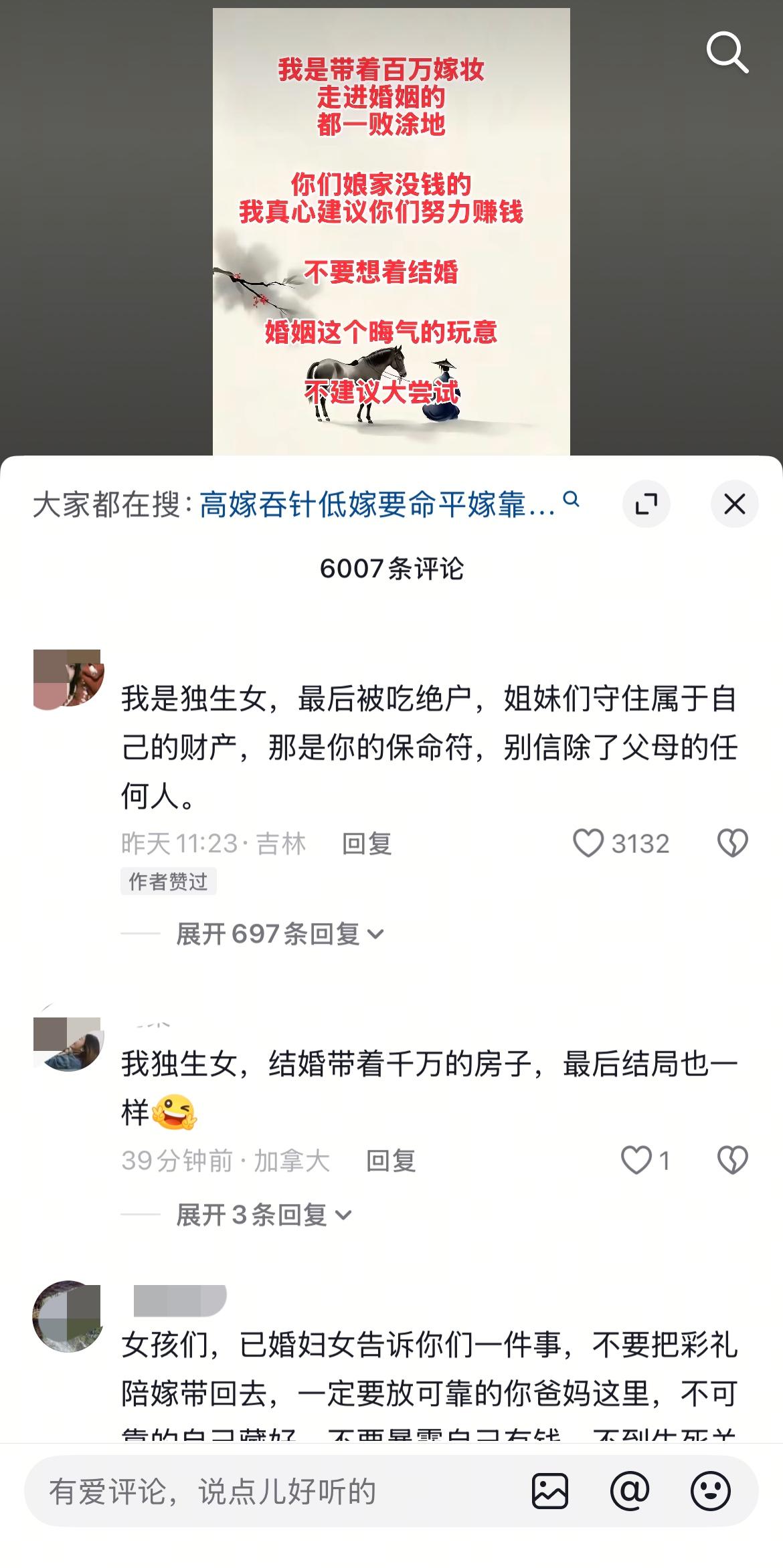 网友说:百万嫁妆依然在婚姻里一败涂地。千万不要羡慕任何一个已婚女性,高嫁吞针低嫁