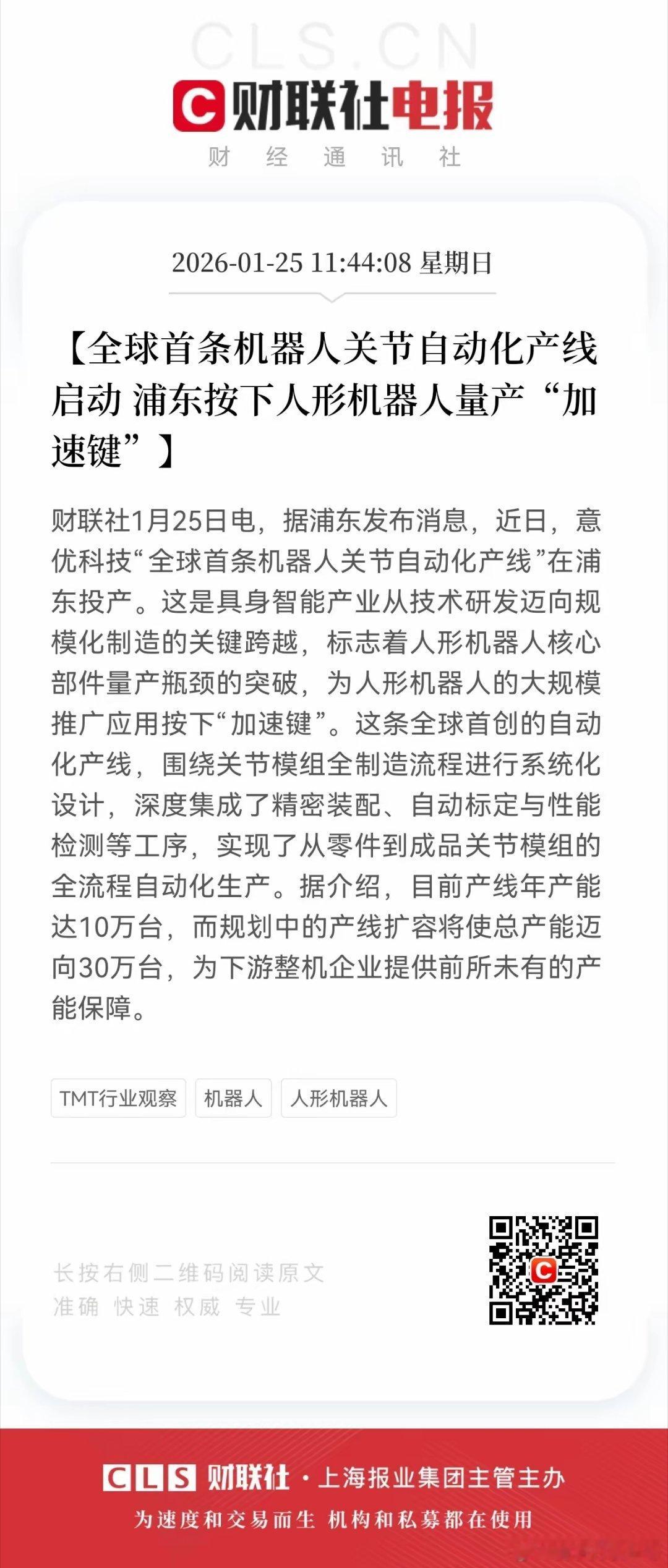 金价利好!重大利好!机器人板块迎来重大利好!全球首条机器人关节产线投产,人形机器人量产“卡脖子”环节破局,产业链要迎订单潮意优科技全球首条机器人关节自动化产线在浦东投产(年产能10万台、规划扩至30万台),这是人形机器人从“实验室样品”转向“规模化量产”的关键突破——关节模组是人形机器人的核心部件(单台需12-20个关节),产线落地直接解决了核心部件的量产瓶颈,将带动人形机器人整机及上下游产业链的订单放量。从投资逻辑看,核心是“核心部件-整机-下游应用”的全链机会:关节模组产线突破后,整机企业的量产进度将加速;关节模组的核心材料、零部件供应商将直接受益于产能扩张;人形机器人的商业化应用场景(工业、服务)将随成本下降逐步打开。人形机器人产业链概念股清单一、关节模组核心部件/材料龙头绿的谐波(688017):谐波减速器龙头,是机器人关节的核心传动部件供应商;双环传动(002472):RV减速器供应商,适配人形机器人关节的高精度传动需求;拓普集团(601689):机器人关节模组供应商,布局一体化关节的研发与生产;三花智控(002050):电子膨胀阀龙头,其精密部件可应用于关节模组的控制单元;新时达(002527):伺服系统供应商,支撑机器人关节的动力控制需求。二、人形机器人整机龙头优必选(未上市):人形机器人整机企业,关节模组需求将随产线落地加速;科沃斯(603486):服务机器人龙头,布局人形机器人的家庭服务场景;石头科技(688169):智能硬件企业,拓展人形机器人的家用、商用场景。三、核心材料/零部件龙头光威复材(300699):碳纤维复合材料供应商,用于关节模组的轻量化结构;中科三环(000970):稀土永磁材料龙头,其磁体部件应用于关节模组的电机;汇川技术(300124):工业自动化龙头,提供关节模组的驱动与控制系统。四、下游应用场景龙头美的集团(000333):工业机器人龙头,将人形机器人应用于智能制造场景;格力电器(000651):布局人形机器人的工业、家庭服务双场景;科大讯飞(002230):AI语音交互龙头,为人形机器人提供智能交互解决方案。机器人关节产线的落地,是人形机器人产业化的“临门一脚”——核心部件的量产将推动整机成本下降,进而打开商业化应用空间,产业链各环节的企业将在“产能释放-订单放量-场景落地”的逻辑中实现业绩与估值的双重提升。