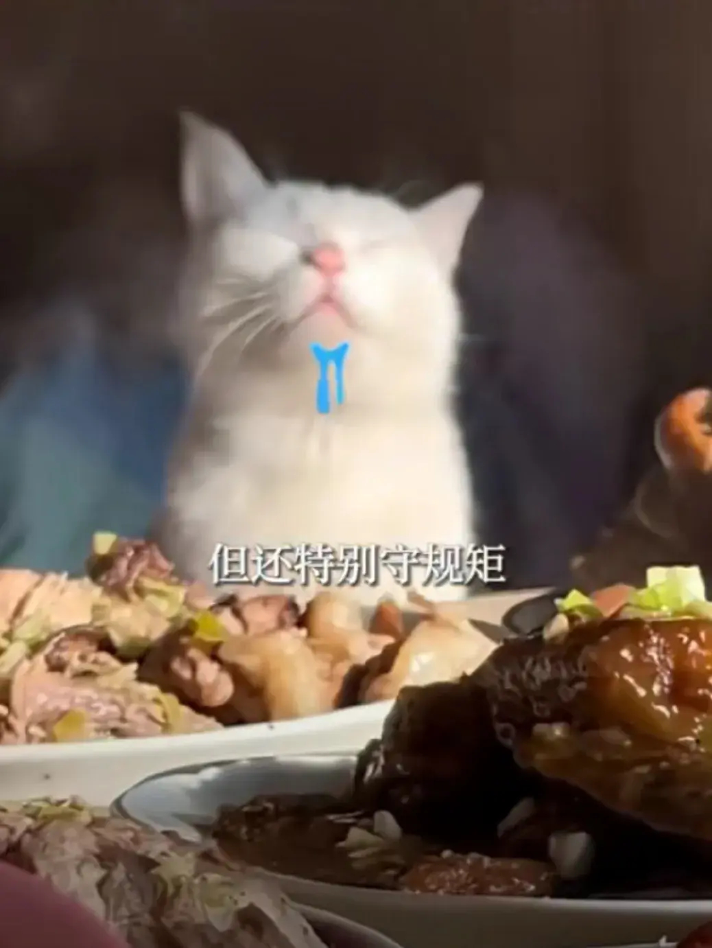 过年主人准备了一桌丰盛大餐,桌上全是肉,小猫咪虽然很喜欢很馋,,但还是很守规矩,闭着眼睛闻陶醉了,主人说,它虽然馋,但是从来不上桌偷吃。真是只有素质的猫啊。