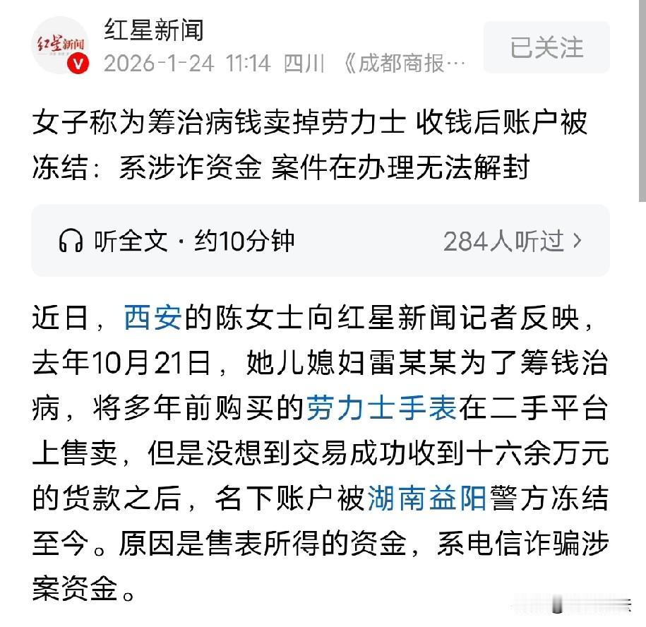 天塌了!陕西西安,女子得了癌症,为治病,把一块名牌手表卖了16.4万,收到钱第二天,银行账户被冻结,女子傻了眼,报警一查,说这16万是涉诈资金,女子拿出证据想解封,可没成功,警方协商女子和受害人双方均摊损失,女子不同意,警方回应:女子也有过错,因她还没排除洗钱的嫌疑,手表还在寻找中,解封可能还要等…… 陈女士可愁坏了,她的儿媳妇雷女士身患重病,本想卖一块劳力士手表用这笔钱治病呢结果,钱到账了,紧接着银行账户就被冻结了。 原来,雷女士十年前就得了甲状腺癌,当时做完手术,恢复得还算不错,一家人也松了口气。 可谁能想到,这几年这癌细胞又跑到了肺部。而雷女士在医院的诊断证明,上面写得明明白白:甲状腺恶性肿瘤术后同位素治疗,还有颈部淋巴结转移癌、肺转移癌和低钙血症。看着这些字,就知道雷女士这些年遭了多少罪。 之前,雷女士和丈夫为了生活,开了家烧烤店,本来想着能挣点钱补贴家用,可这生意啊,就像坐了滑梯一样,一直往下滑,不仅没挣钱,还亏了不少。 为了能有钱治病,雷女士咬咬牙,把多年前花大价钱买的那块劳力士手表挂到了二手交易平台上。 在二手平台上,雷女士和一家二手钟表公司谈得还挺顺利,双方都有买卖的意向。 到了2025年10月21日,公司派了个验表师来雷女士的店铺验表。 这验表师那叫一个专业,拿着放大镜,仔仔细细地查看手表的吊牌、保修卡,不放过任何一个细节,确认是真表后才罢休。 验完表都下午五点多了,双方也谈好了价格16.4万。 可到了打款的时候,这公司就开始耍花样了,说银行下班了,对公账户打不了款,让想买表的客户直接把钱转给给雷女士。 陈女士当时还多了个心眼,查了查公司的营业执照,看着没啥问题,就同意了。 她后来回忆说:“我们当时没有防备啊,以为能收到钱就行,也没想那么多。” 当钱到账后,验表师拿着表就走了。 谁能想到,第二天,雷女士就发现收钱的银行账户被冻结了。 这可把一家人急坏了,赶紧报警。 一查才知道,是湖南益阳警方冻结的。据了解雷女士账户里的16万多元是电信诈骗的涉案资金,所以账户才被冻结。 婆婆陈女士赶紧和益阳警方沟通,把二手平台的聊天记录、验表师验表的视频等资料都一股脑地发给了警方。 就想证明自己一家人没参与电信诈骗洗钱,是实实在在的受害者,希望警方能解封账户,挽回点损失。可左等右等,一直都没成功。 原来,在陈女士一家提供了证据后,益阳警方就开始追查手表的去向。 那名验表师拿到表后,就像接到了什么秘密任务一样,直接去了机场,把手表交给了一个接头人。这接头人也不含糊,又把表转交给另一个接头人,之后这手表就像长了翅膀一样,不知去哪儿了。 警方一直在努力追查,目前已经控制了转移手表环节中的两个人。可这手表还是没找到,就像一颗定时炸弹,让陈女士一家心里一直悬着。 手表没了,账户还被冻结,陈女士一家真是又着急又无奈。 陈女士说:“我们承认自己法律意识淡薄,就觉得一手交钱一手交货就没事了,付钱时我们没走平台交易,就想快点拿到钱,谁能想到要弄清楚钱是哪儿来的,而且,我们也没能力去查钱的来源。” 之后,陈女士代表儿媳妇多次和益阳警方沟通,想着能快点解封账户,可每次都是无功而返。 1月15日,警方给陈女士打电话,说接表人已经到案了,如果雷女士家能主动退赃,毕竟这笔钱是被骗的,受害人可以出具谅解书,问陈女士愿不愿意和受害人协商,双方各退一步退款。 陈女士一听就拒绝了,她说,“我们是正常买卖手表,可警方要求我们退赔,而且说了三次,我们不同意,我们完成交付了,为啥要我们退赔呢?” 益阳警方负责人说,案子还在查,雷女士的账户暂时解封不了。因为这笔钱是电信诈骗的赃款,雷女士作为卖家还没完全洗清洗钱嫌疑。 目前警方已经抓了两个嫌疑人,还在顺着线索找那块失踪的劳力士表。 负责人也承认,冻结有期限,最多再冻一次,到期肯定给说法。 但他觉得这事儿双方都有责任:雷女士图省事不走平台,私下转账,这在民事上肯定有过错。 之前警方提议让两边商量着分摊损失,别让受害人全扛,但雷女士家态度坚决,不同意退钱。 警方也没办法,只能按规矩办案,不能因为她生病急需用钱就违法解封,毕竟法大于情。 这事儿,确实挺让人焦虑的,雷女士本来就不容易,身患重病又家里生意亏损,就想卖块表凑点钱治病,结果却陷入了这样的麻烦。 同时咱们提了个醒,在进行交易的时候,一定要提高防范意识,转账通过平台,走正规渠道,免得一不小心就可能惹上大麻烦。 雷女士就是吃了着急用钱,私下和买方交易,如果当时她通过平台就不会这样了,所以,大事要慢慢办,多想想,千万不要着急,因为着急很容易出错。