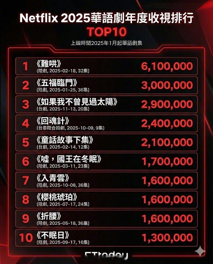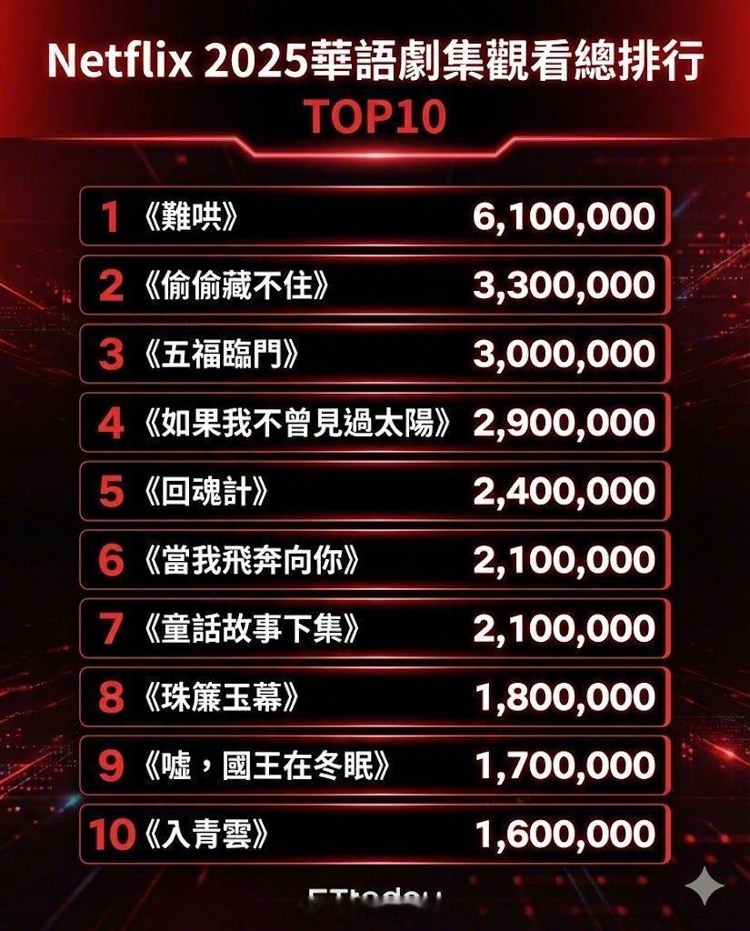 Netflix 2025华语剧排行出炉! 《难哄》夺冠!白敬亭章若楠《难哄》在网飞2025华语剧双榜夺冠!观看次数610万(Views)位居第一,第二名的《偷偷藏不住》。。《嘘,国王在冬眠》、《偷偷藏不住》也都榜上有名。宋祖儿、刘宇宁主演的《折腰》上榜。 赵露思从2023年《偷偷藏不住》、2024《珠帘玉幕》到2025年《许我耀眼》,都被列在Netflix前20名华语剧排行榜中。